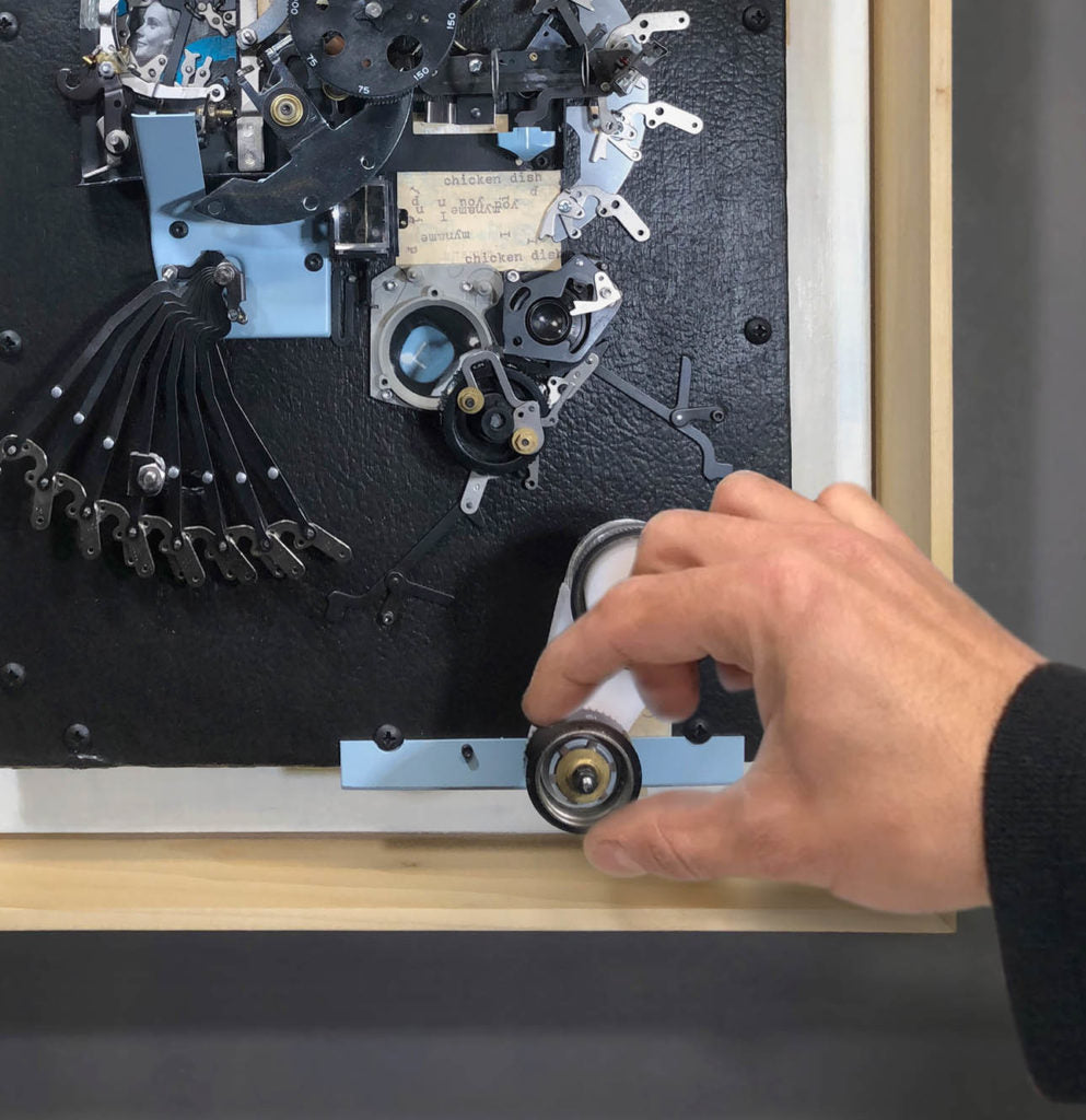 The blue Smith-Corona Coronet Super 10 typewriter that I picked up at a swap meet contained a small plastic container of correction tape. I pried the container open and out fell a correction tape containing the words “chicken dish.” That discovery led to this kinetic automata sculpture that also contains parts from a Polaroid 340 land camera from the same era as the typewriter. Turning the crank spins a set of three internal gears that were cut from plastic. Through various openings, you can view spinning collages and assemblages that piece together memories of these found objects.