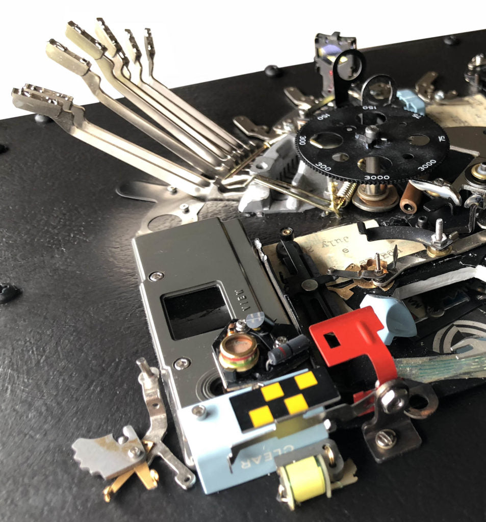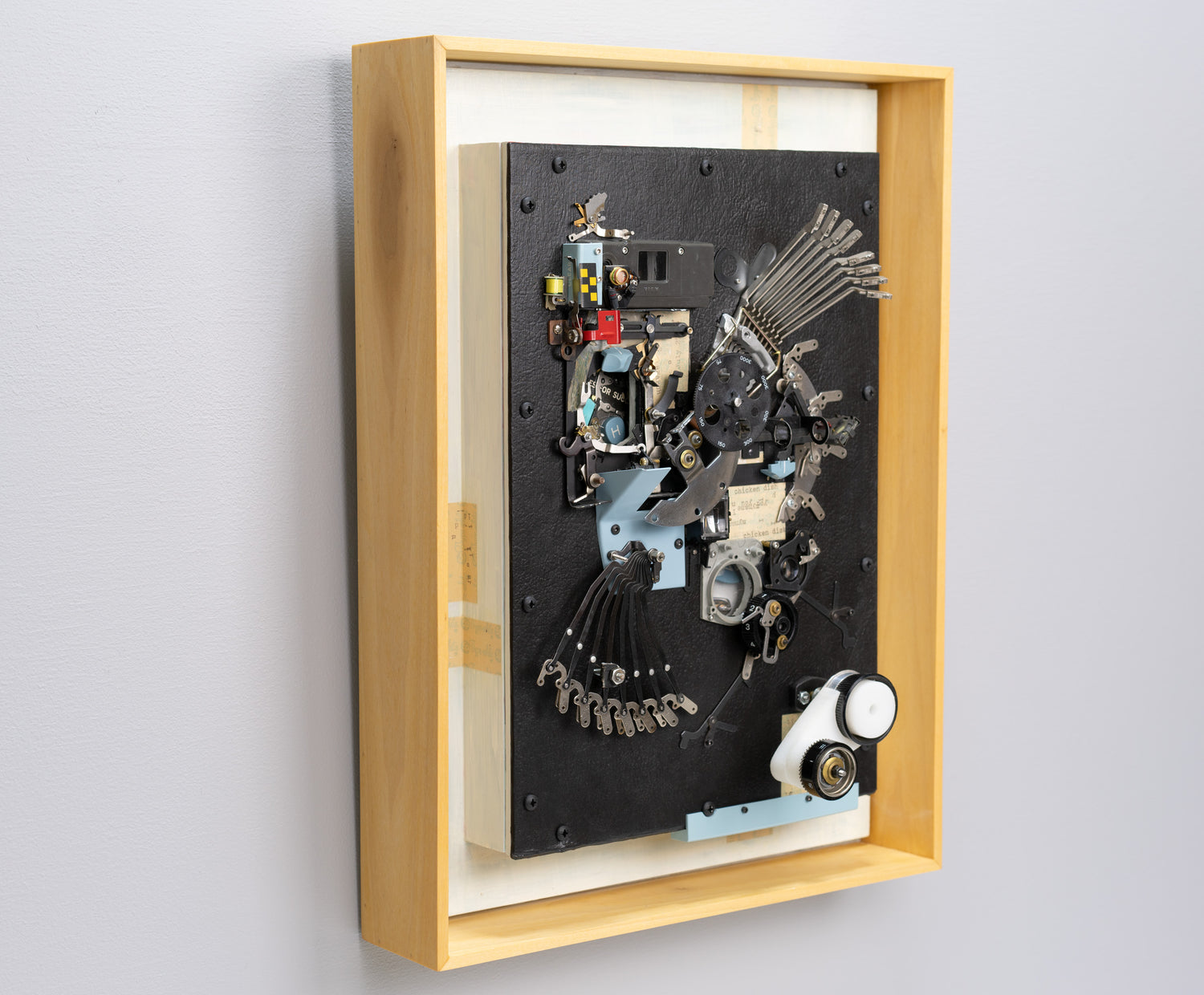 Smith-Corona typewriter parts, Polaroid 340 camera parts, wood, plastic, paint.