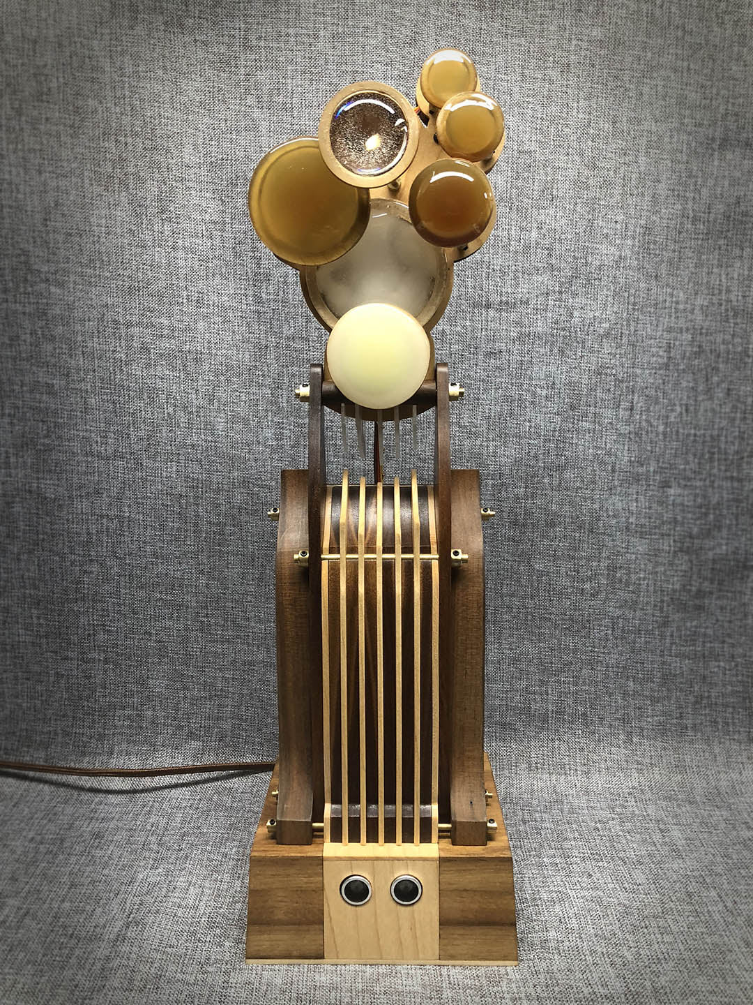 Septocular is an interactive lamp that responds to the proximity of objects (humans) in front of it. When a person is within ~13 feet of Septocular, the seven lens-lamps react. As a person nears Septocular, the rhythm of the light becomes calm and less agitated. The overall design is heavily influenced by architecture and classic mid-century modern design. Septocular was accepted for exhibit at the 2018 National Design In Wood Exhibition at the San Diego County Fair.