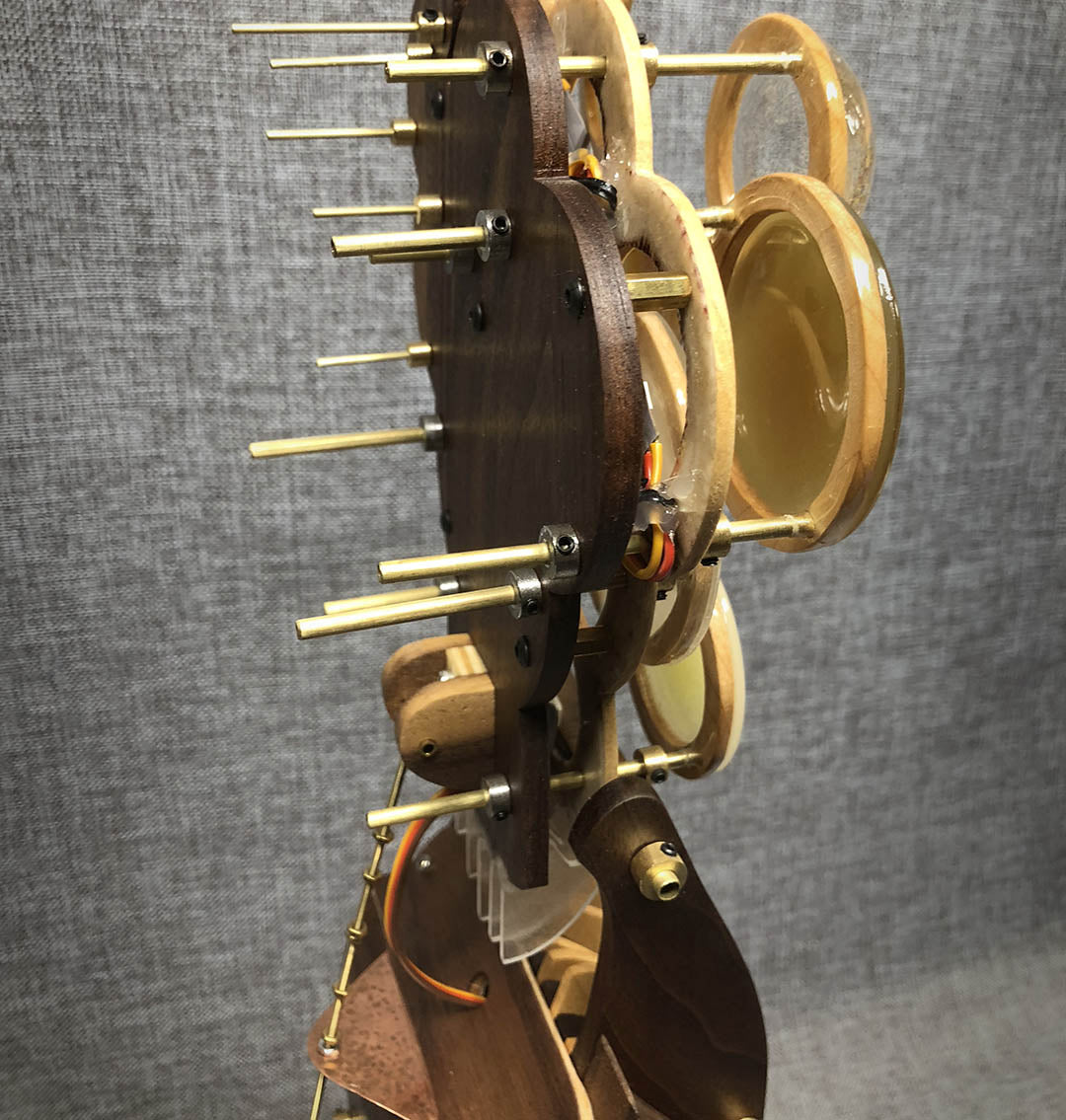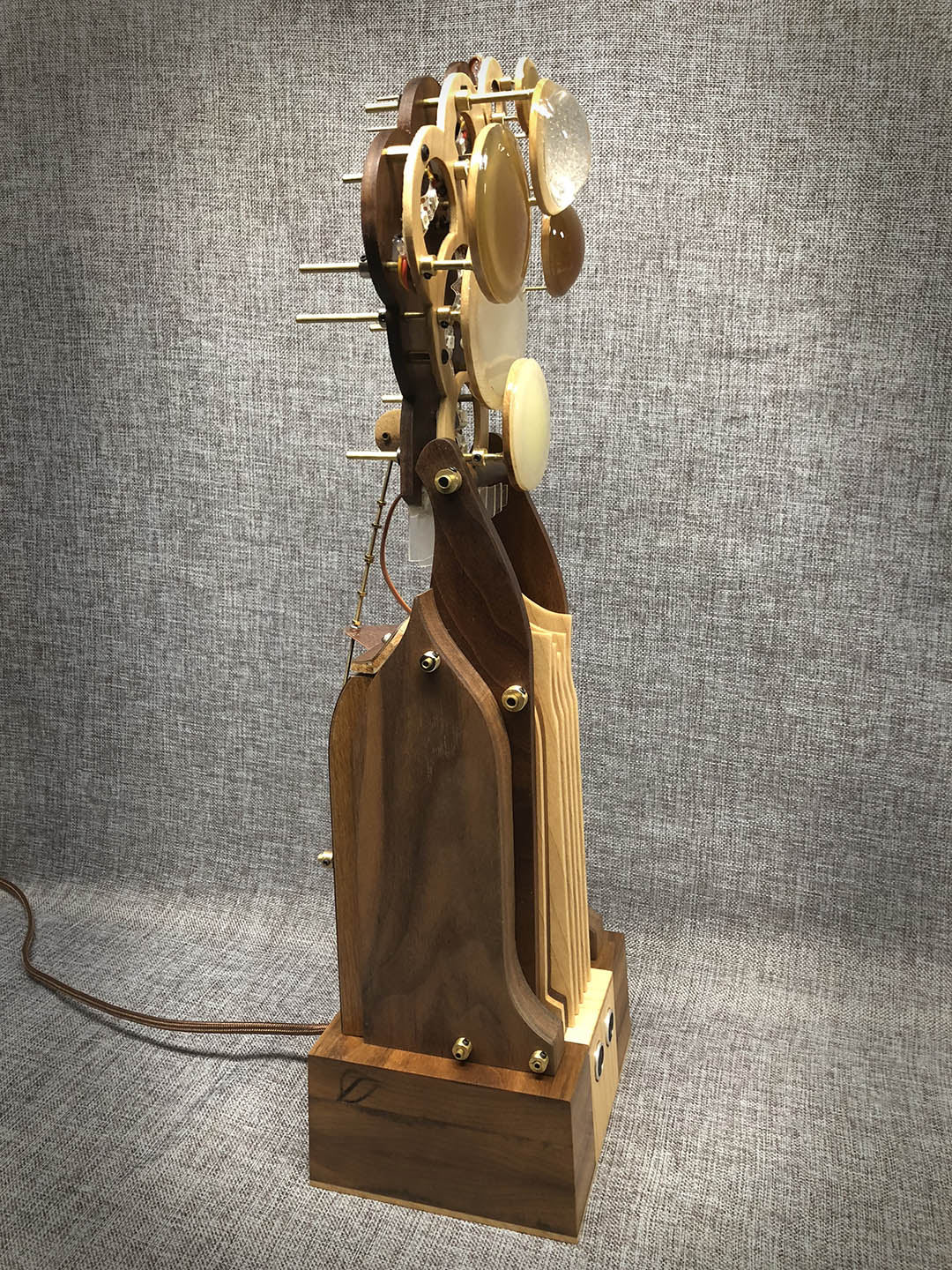 Walnut, maple, brass, resin, arduino, led lights, brass. Not made from found objects.