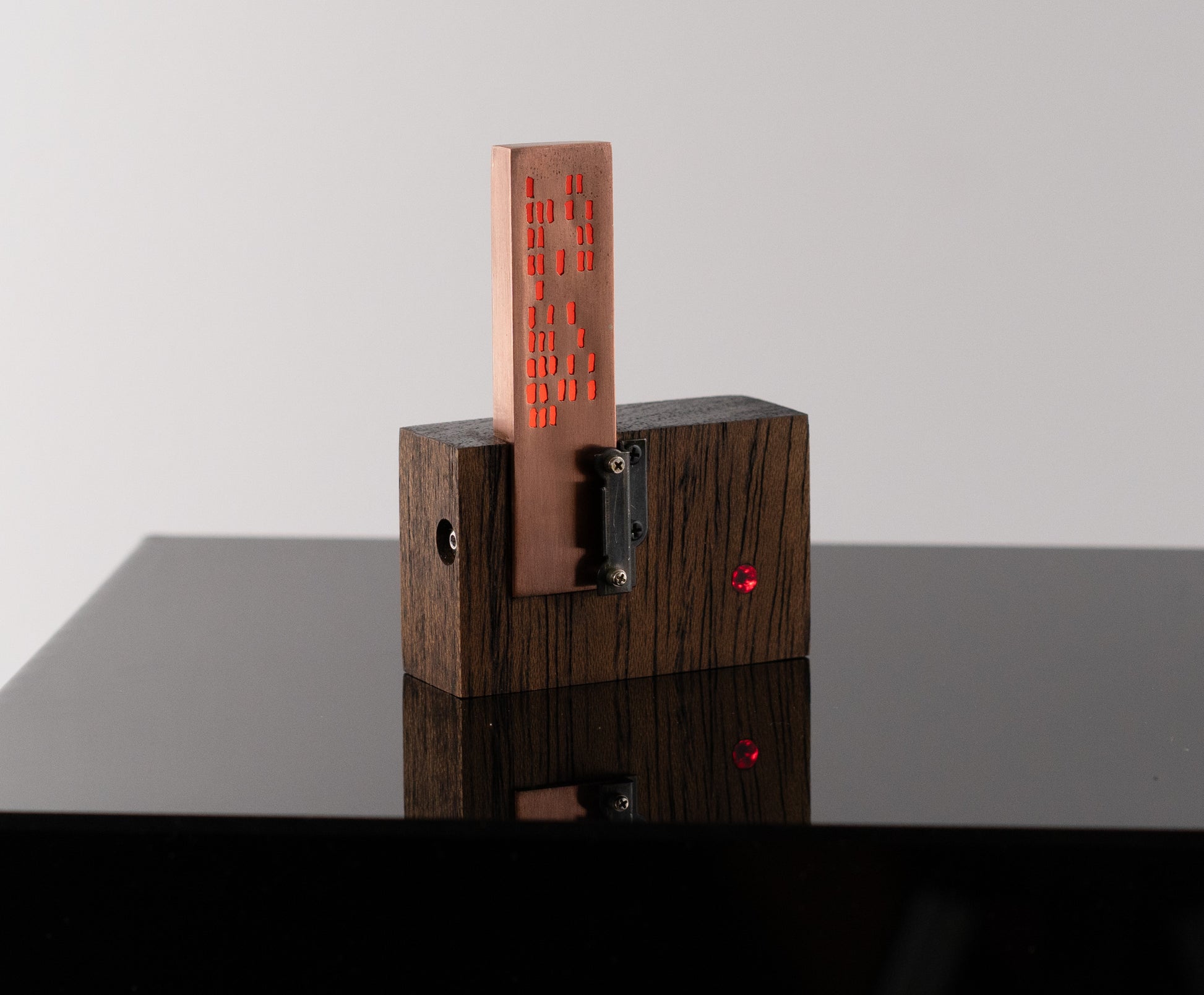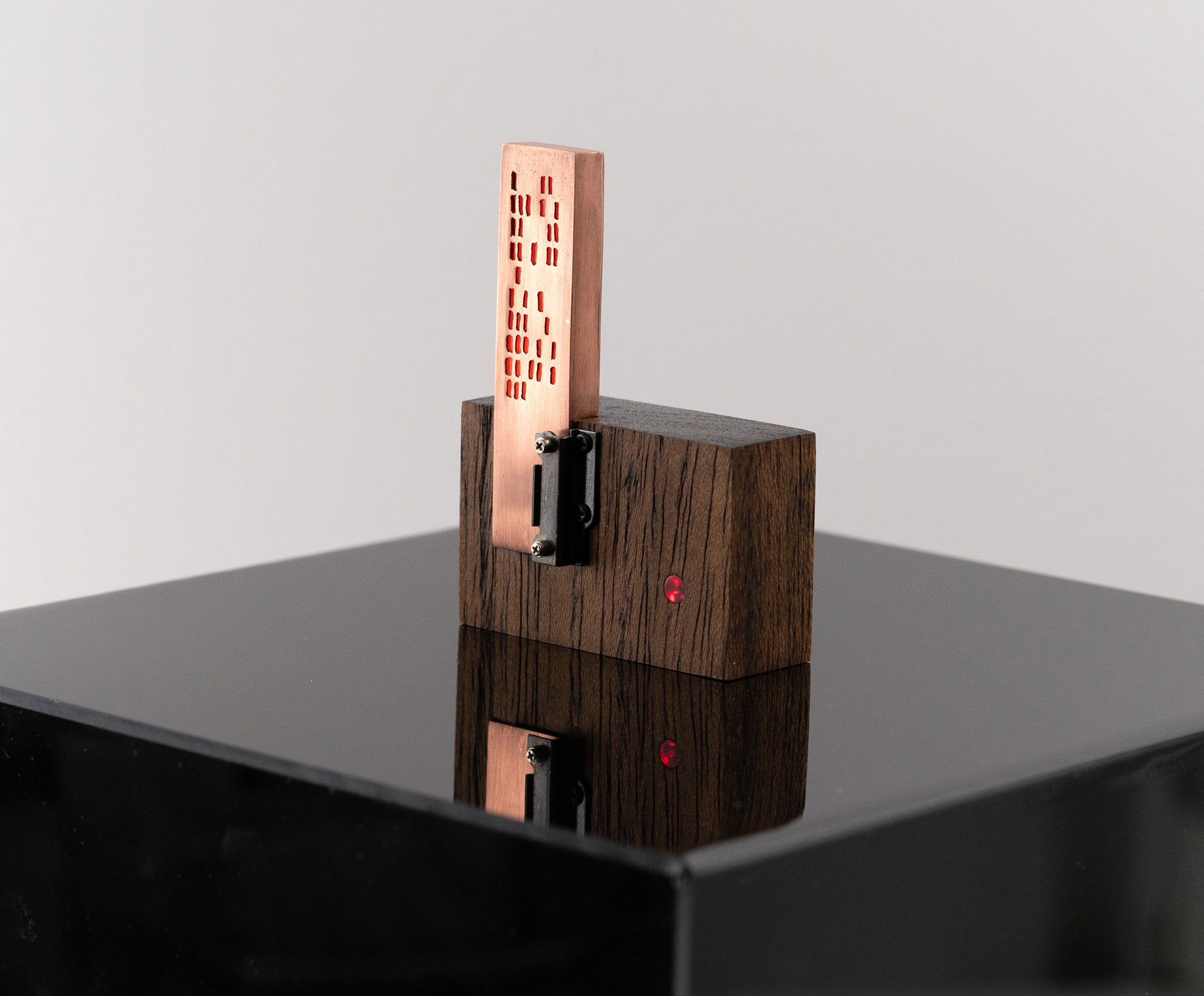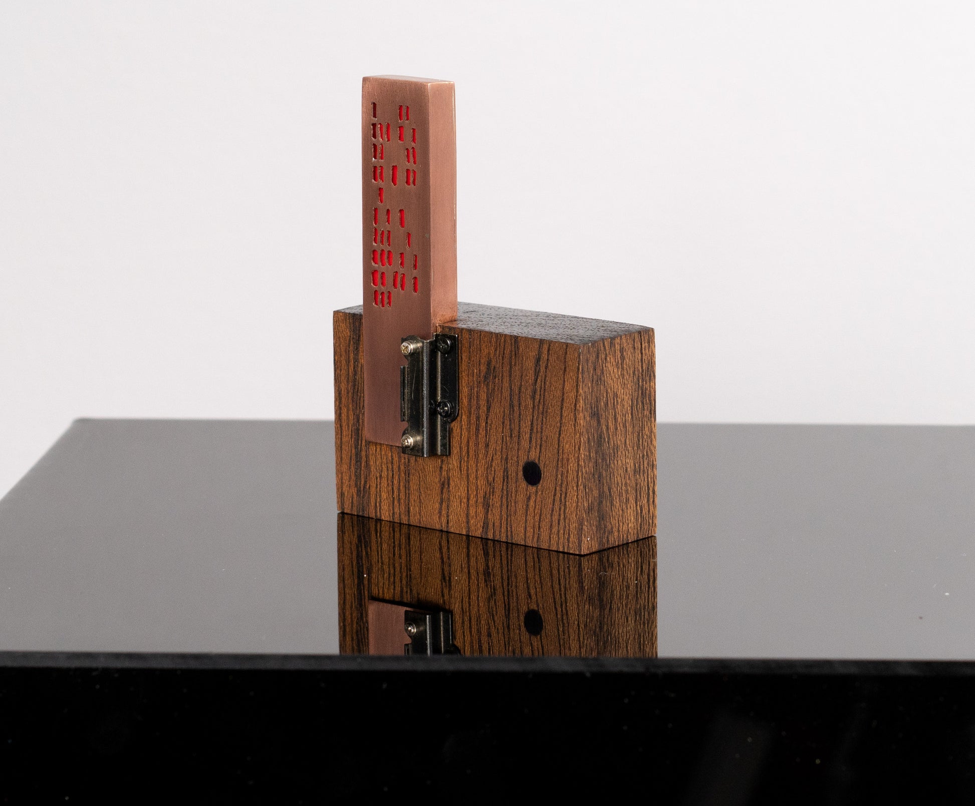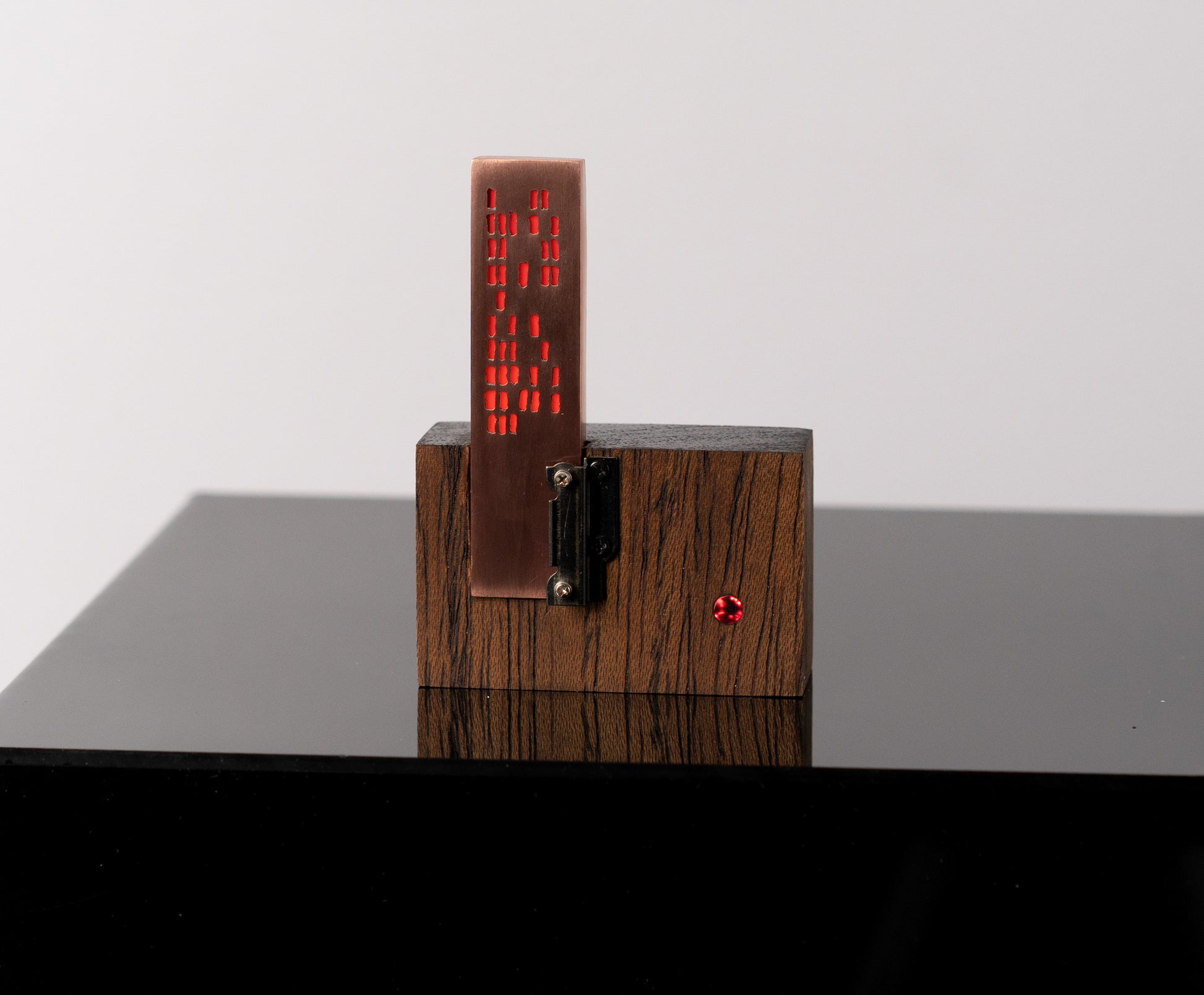 I'm not sure what to call this thing — it's a bespoke, tiny sculpture, thingy or an LED gizmo of some sort. It has an urbran high-rise vibe. I pierced the holes in copper then soldered together an open-ended 'box' that contains a flat LED backlight and an orange photography gel between it and the pierced copper. An additional LED shines through a red acrylic rod that is flush on the front face of the walnut base. There is a coin battery holder on the back with an on/off switch. A small part from a vintage camera adorns the front and also helps hold the copper box in place. The copper will patina over time — this should give more contrast to the orange light coming from inside the copper box.