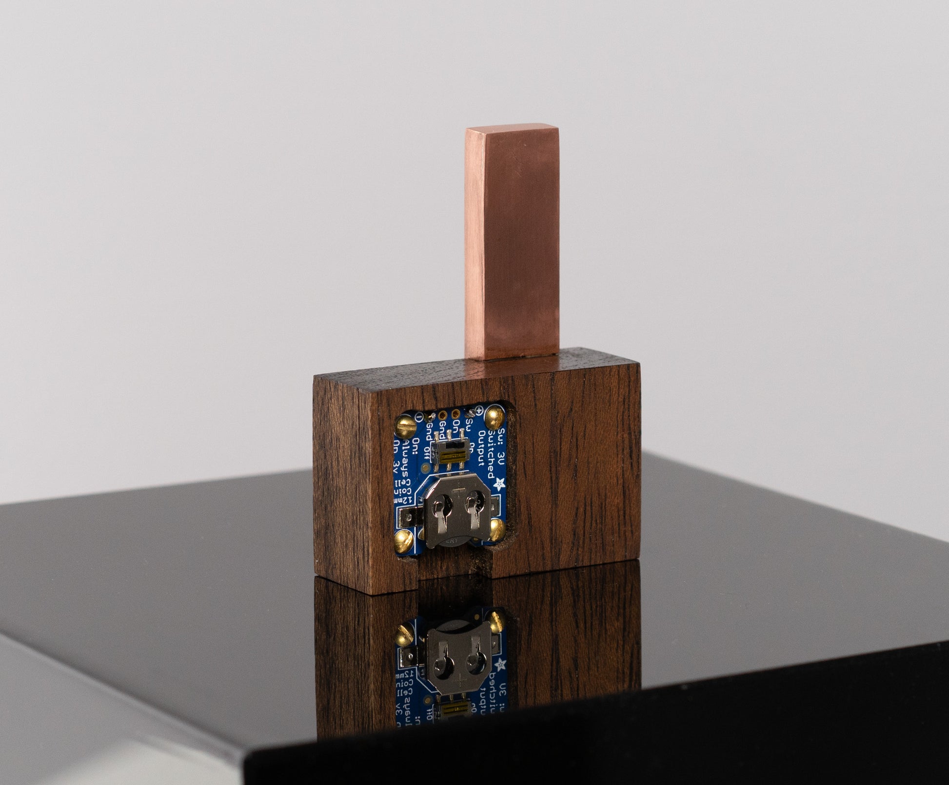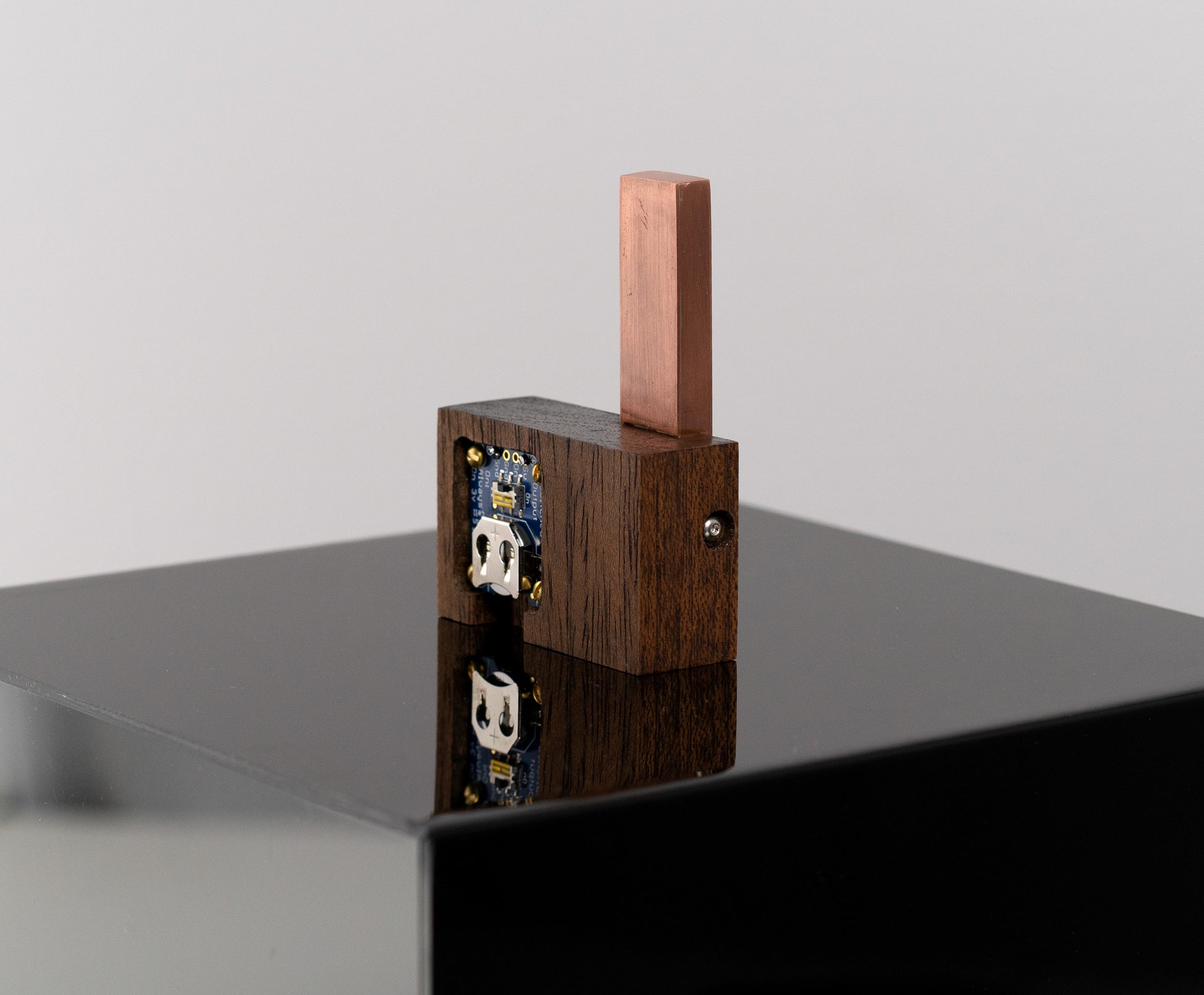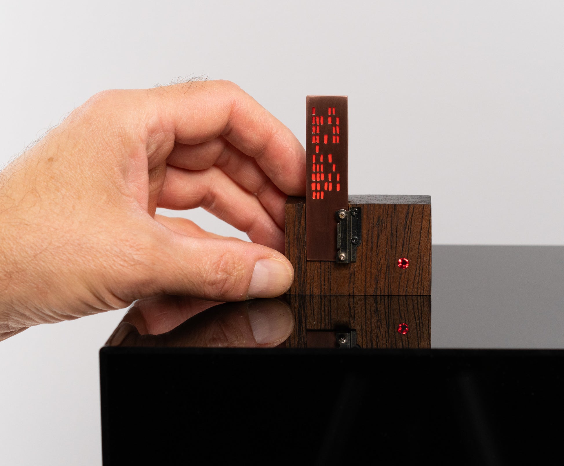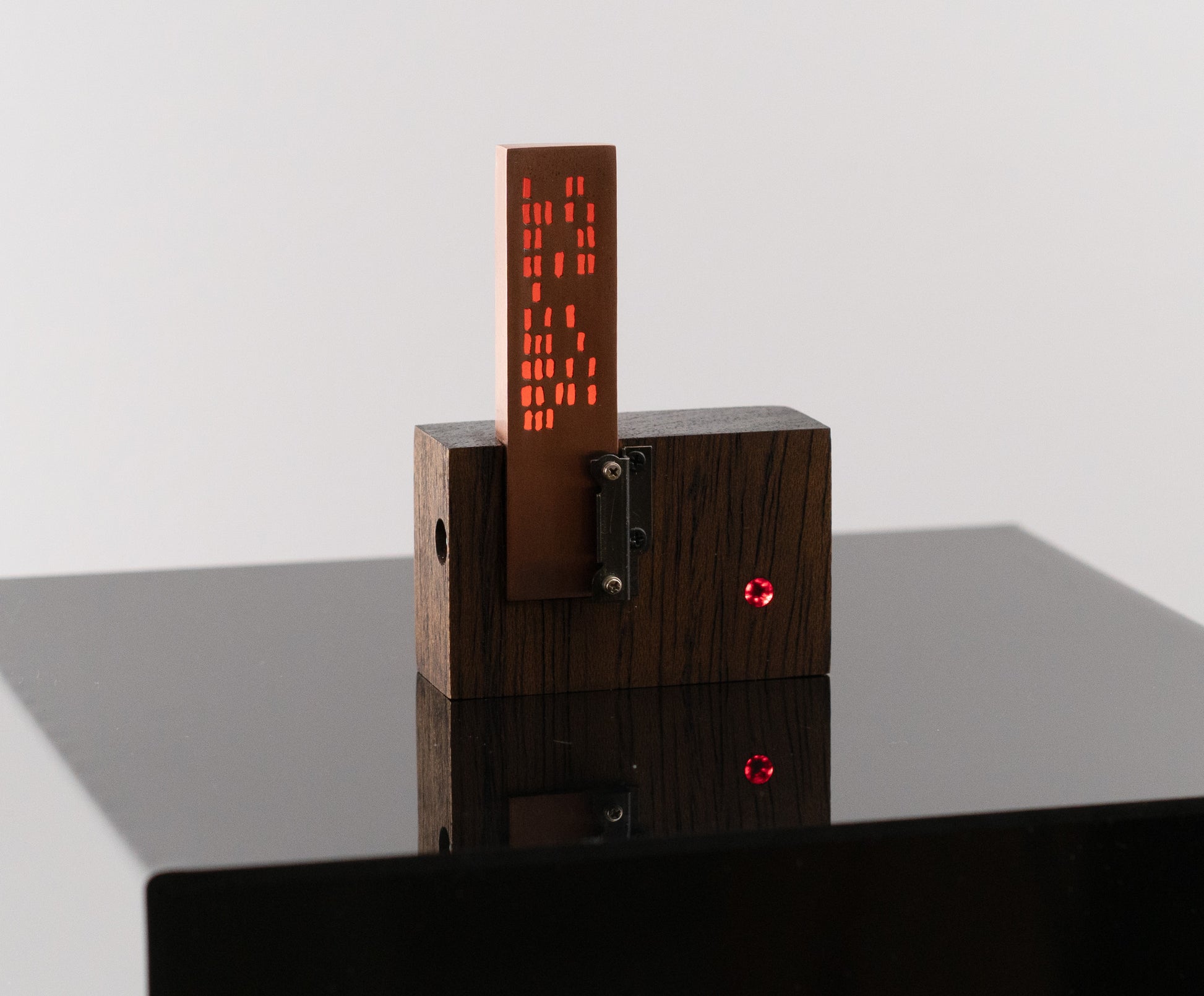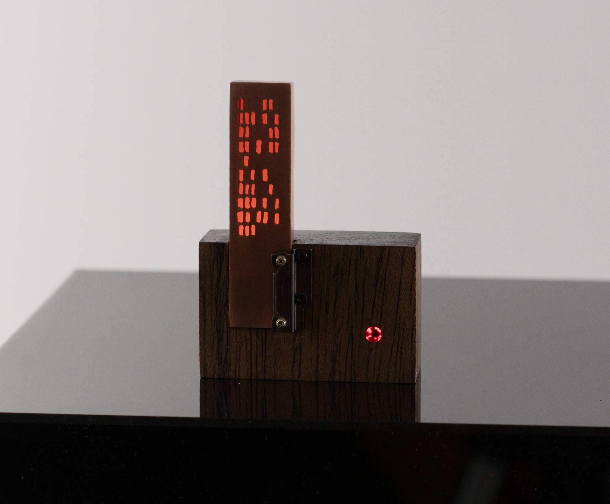 I'm not sure what to call this thing — it's a bespoke, tiny sculpture, thingy or an LED gizmo of some sort. It has an urbran high-rise vibe. I pierced the holes in copper then soldered together an open-ended 'box' that contains a flat LED backlight and an orange photography gel between it and the pierced copper. An additional LED shines through a red acrylic rod that is flush on the front face of the walnut base. There is a coin battery holder on the back with an on/off switch. A small part from a vintage camera adorns the front and also helps hold the copper box in place. The copper will patina over time — this should give more contrast to the orange light coming from inside the copper box.