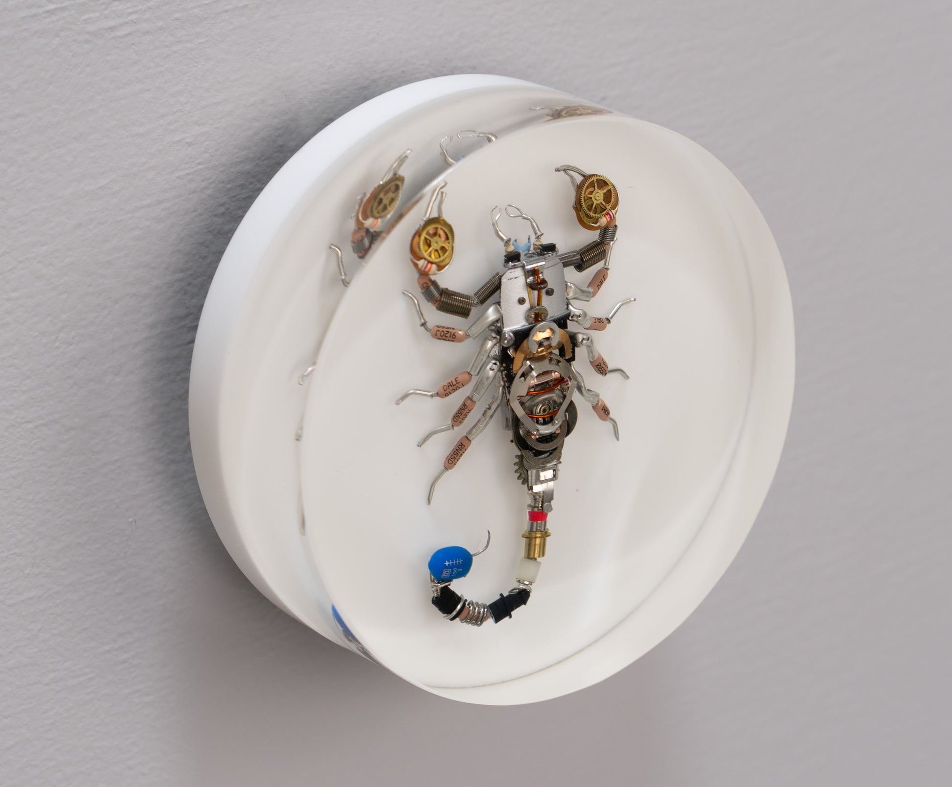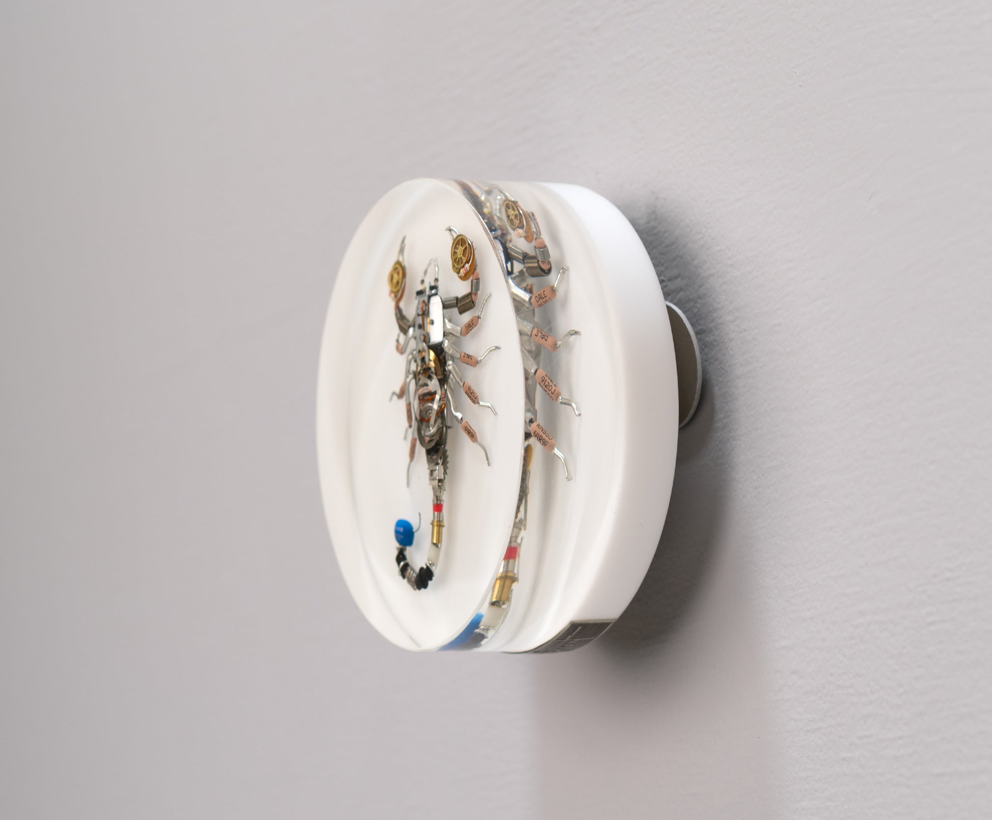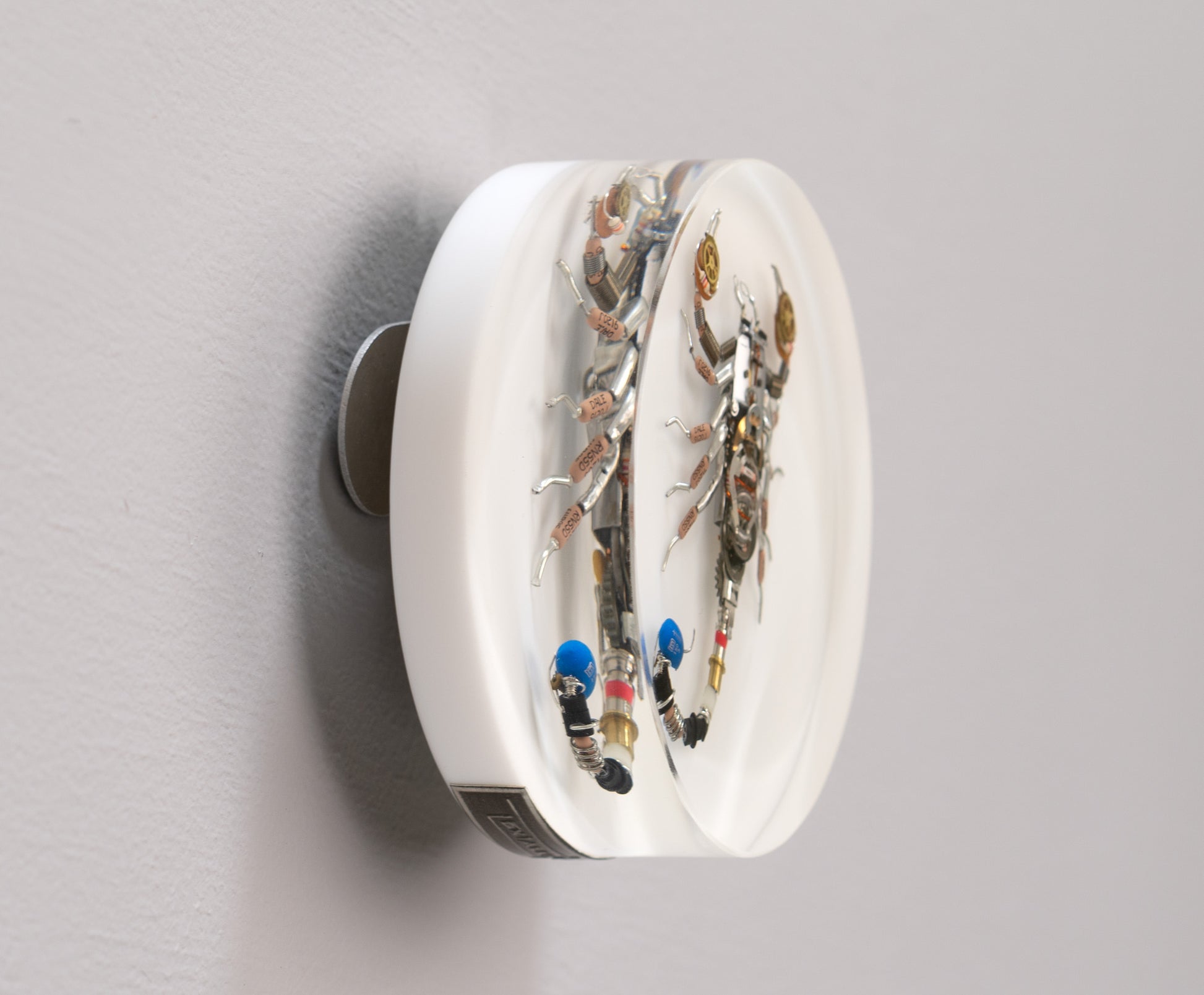 Found objects (camera parts, watch parts, electronics, transformer wire), pressure-cast urethane resin, alum/brass hanger.