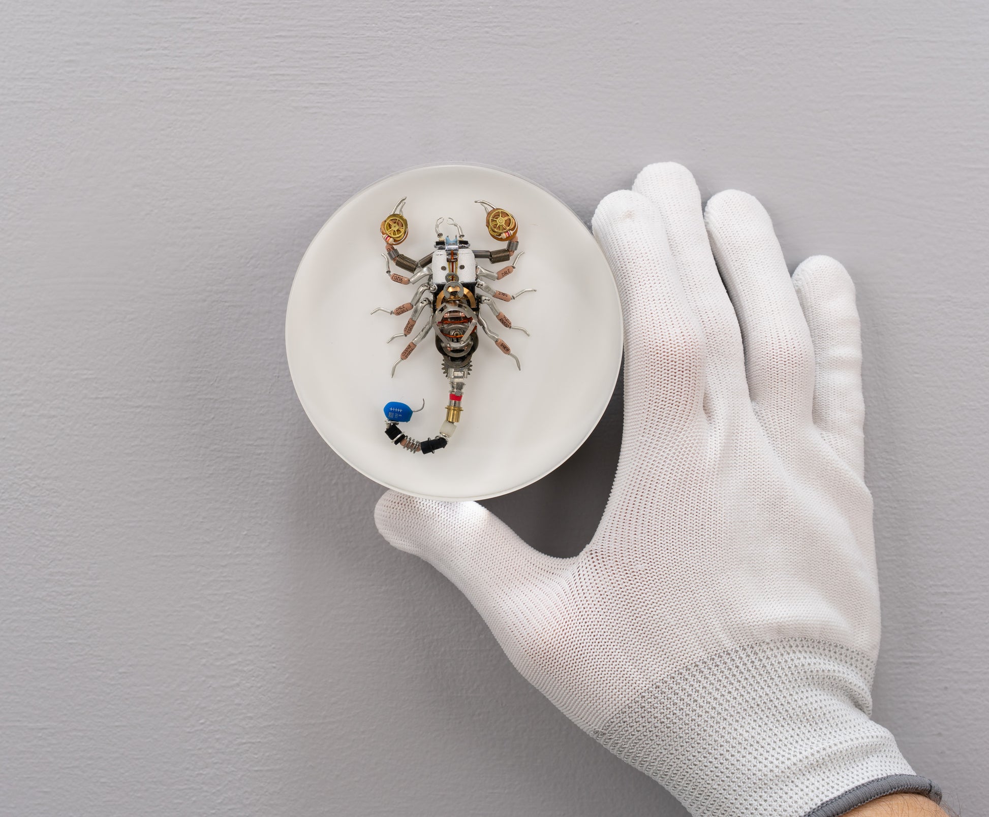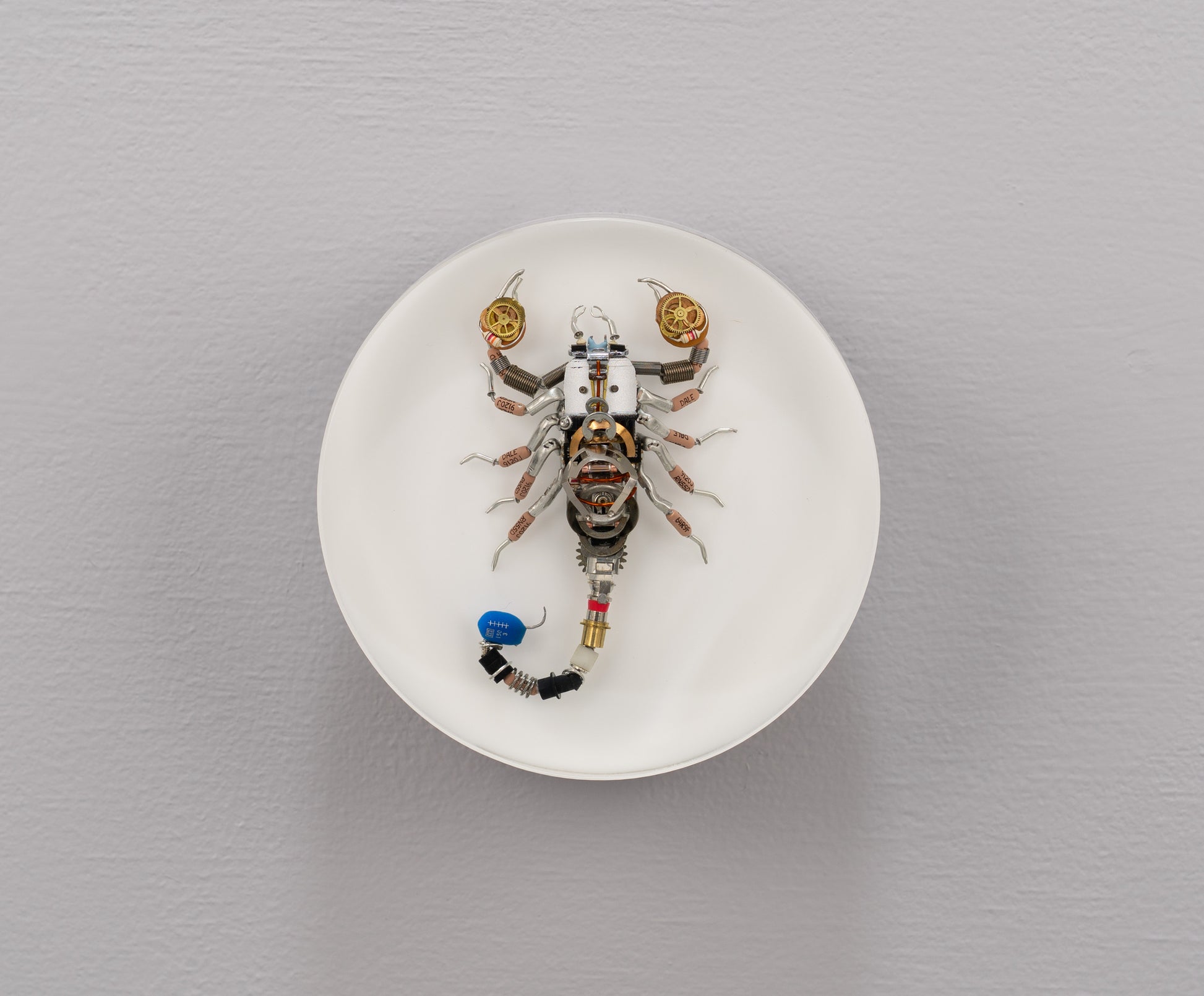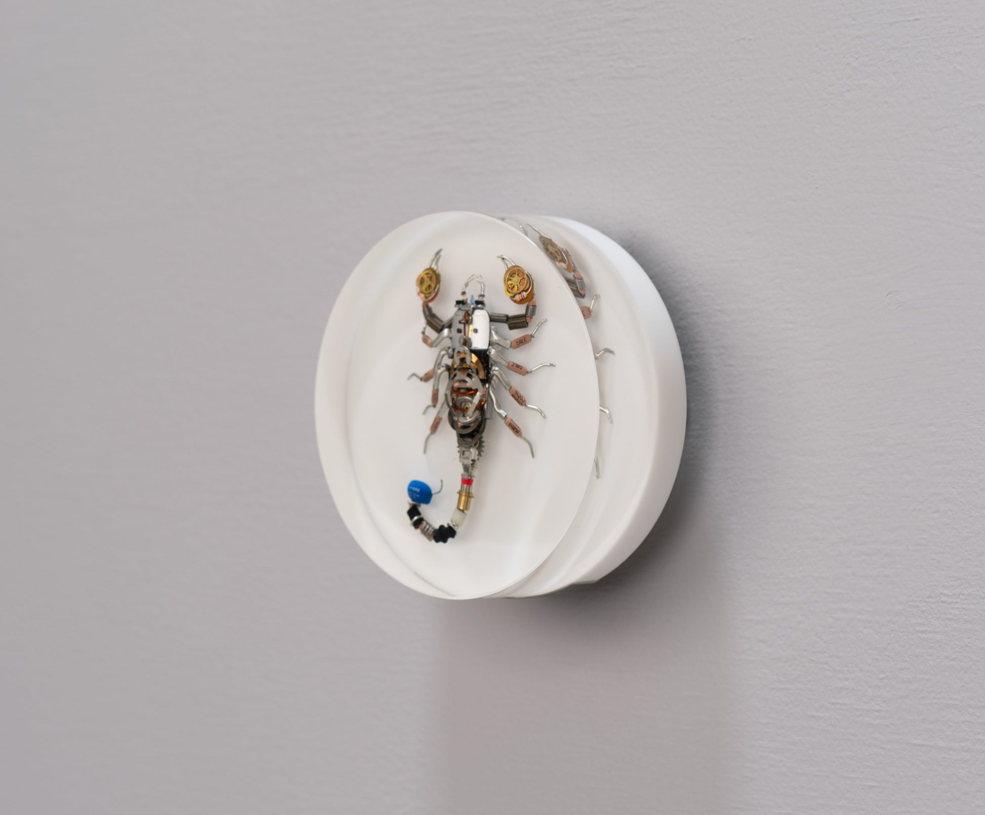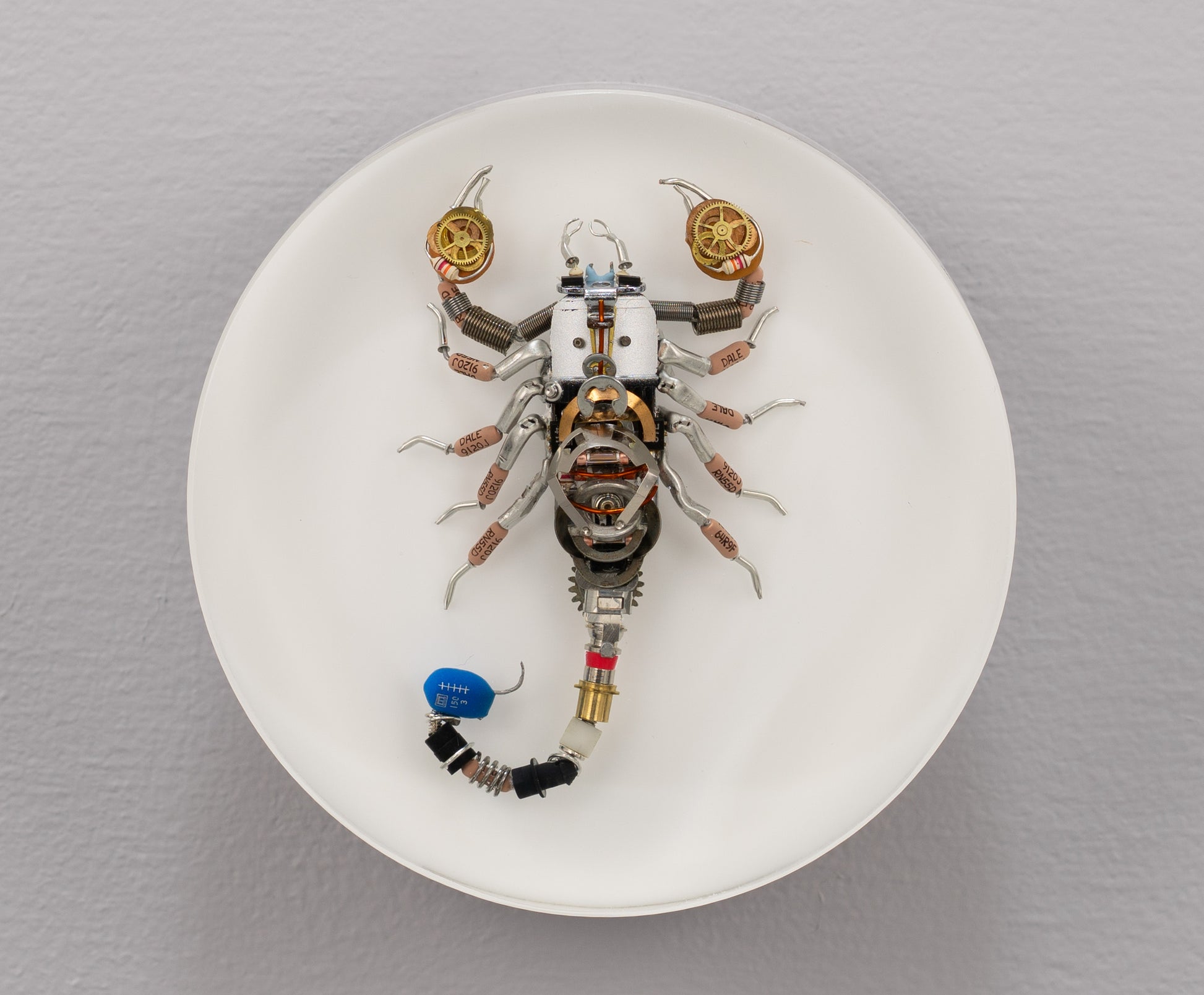 Found objects (camera parts, watch parts, electronics, transformer wire), pressure-cast urethane resin, alum/brass hanger.