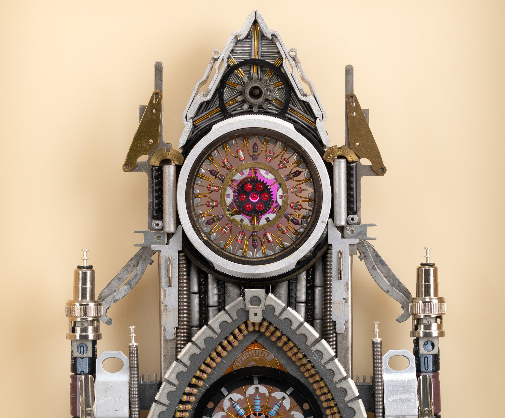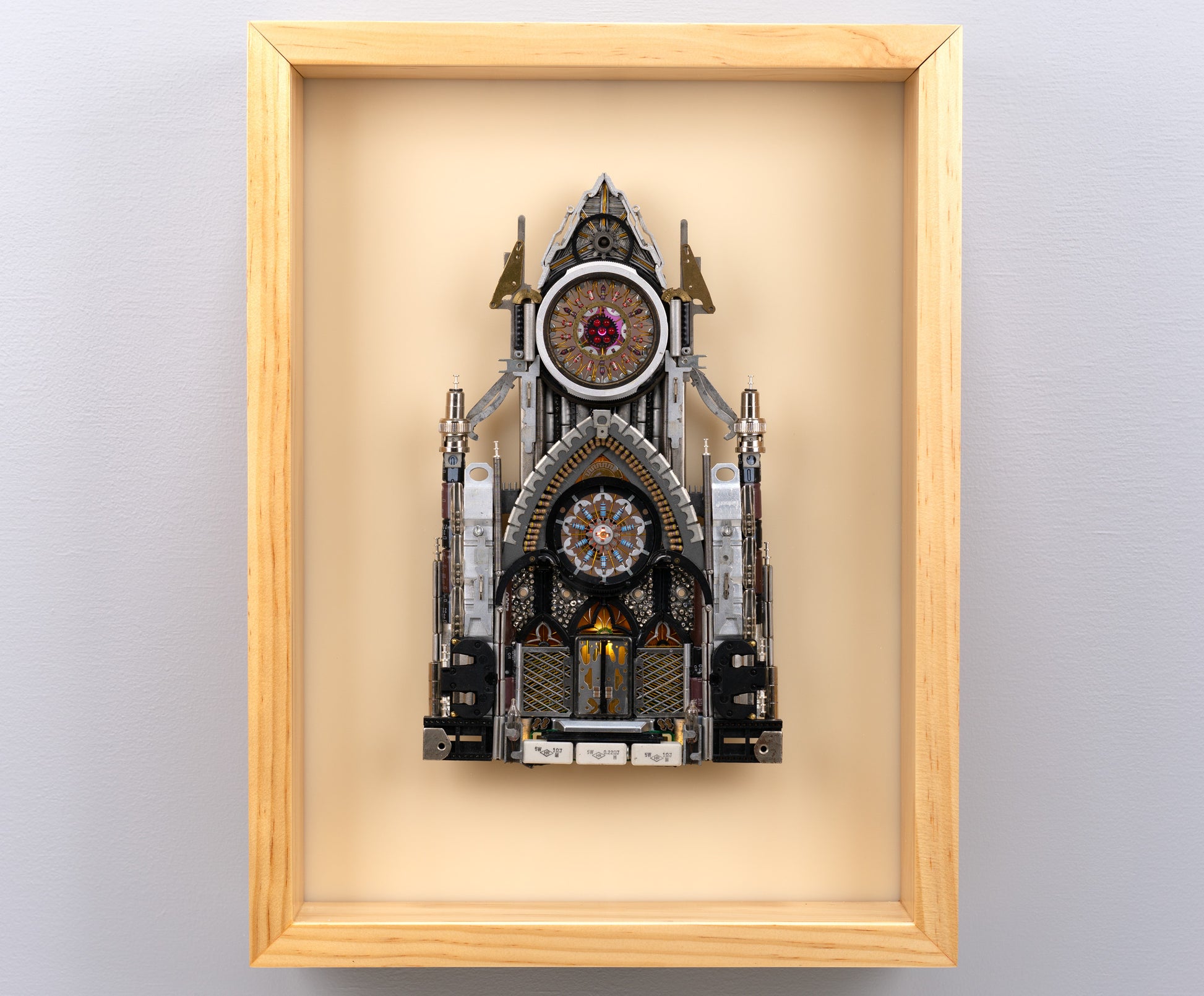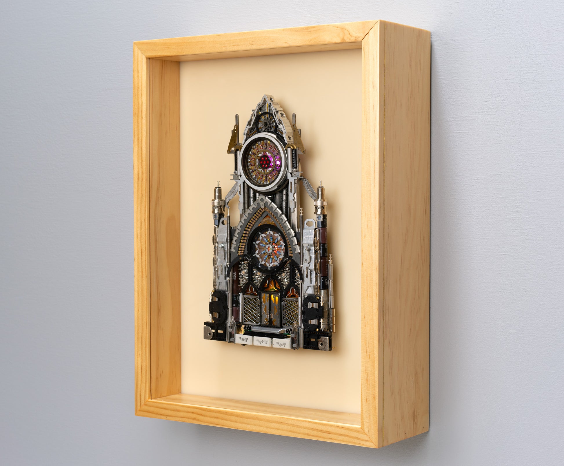 The cathedral is assembled from camera, electronic, and vintage machine parts. There are a number of LEDs backlighting the facade which floats approximately 3/8" away from the background. In low light it resembles light streaming through stained glass — or the outside of a multistory rave. The cathedral is surrounded by a deep, pine, frame with a thin 'halo' of gold leaf applied around the sides with a recessed acrylic front.