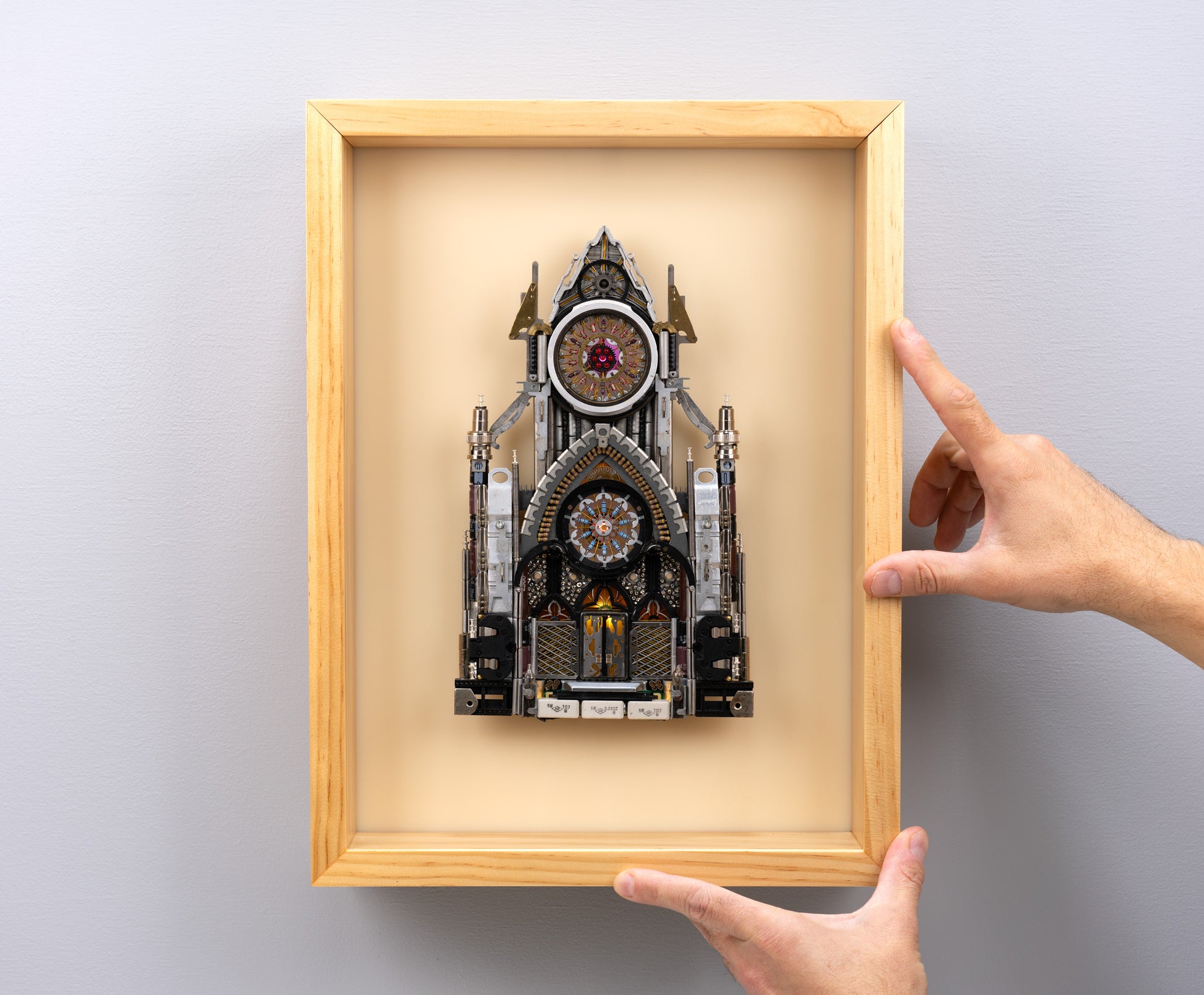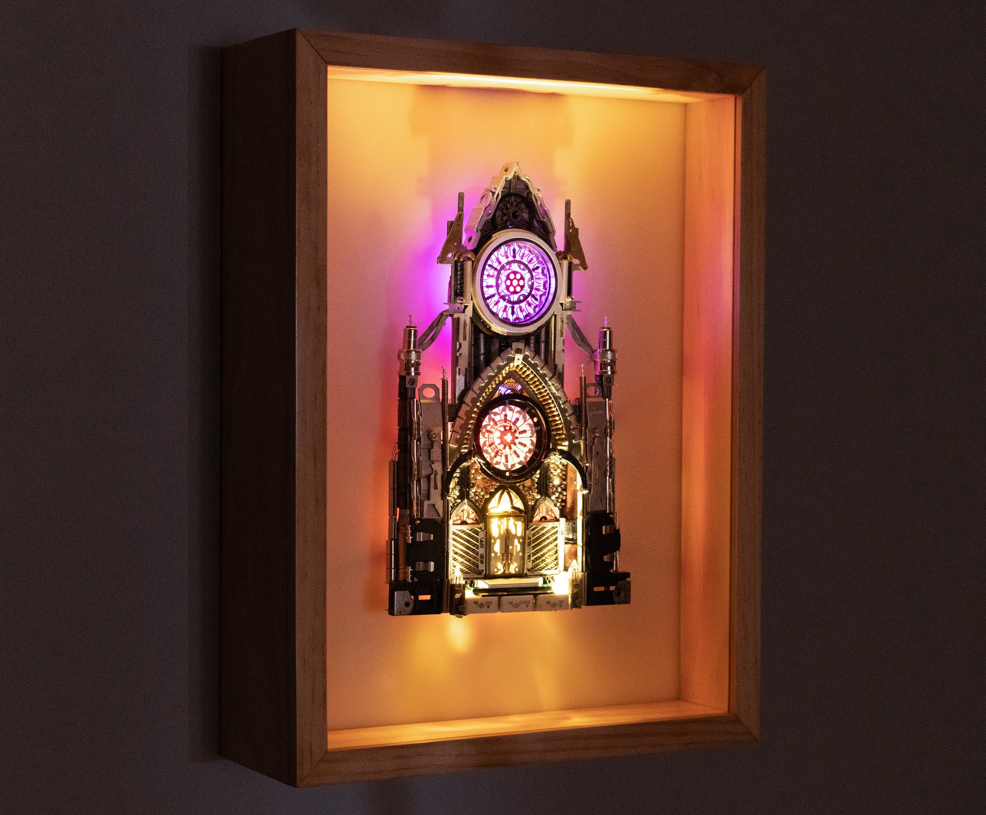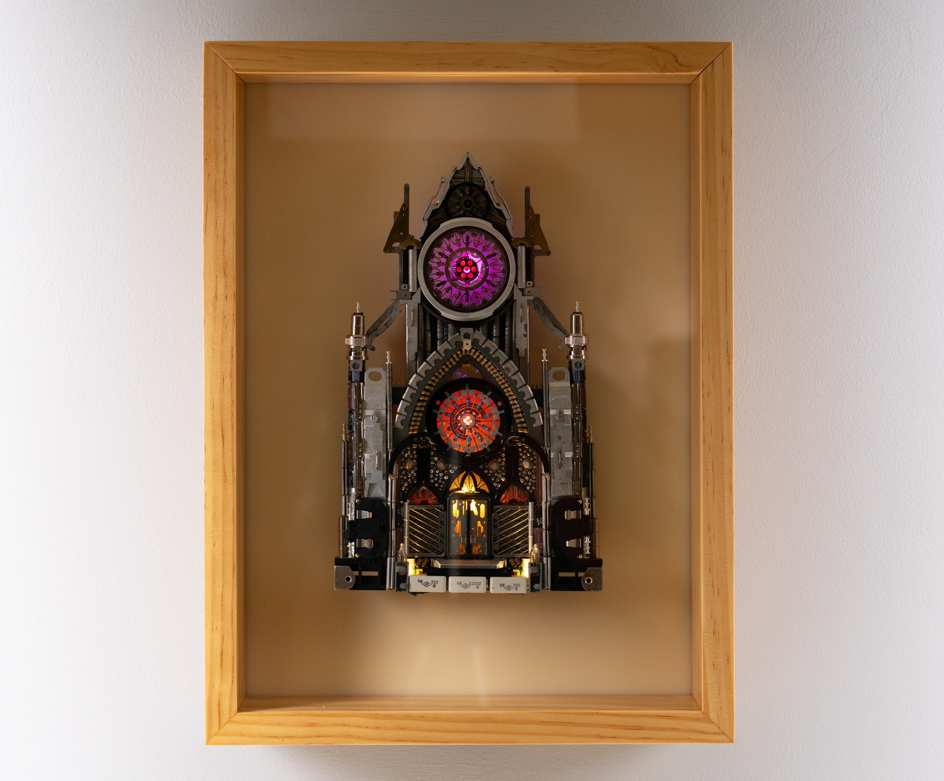 The cathedral is assembled from camera, electronic, and vintage machine parts. There are a number of LEDs backlighting the facade which floats approximately 3/8" away from the background. In low light it resembles light streaming through stained glass — or the outside of a multistory rave. The cathedral is surrounded by a deep, pine, frame with a thin 'halo' of gold leaf applied around the sides with a recessed acrylic front.