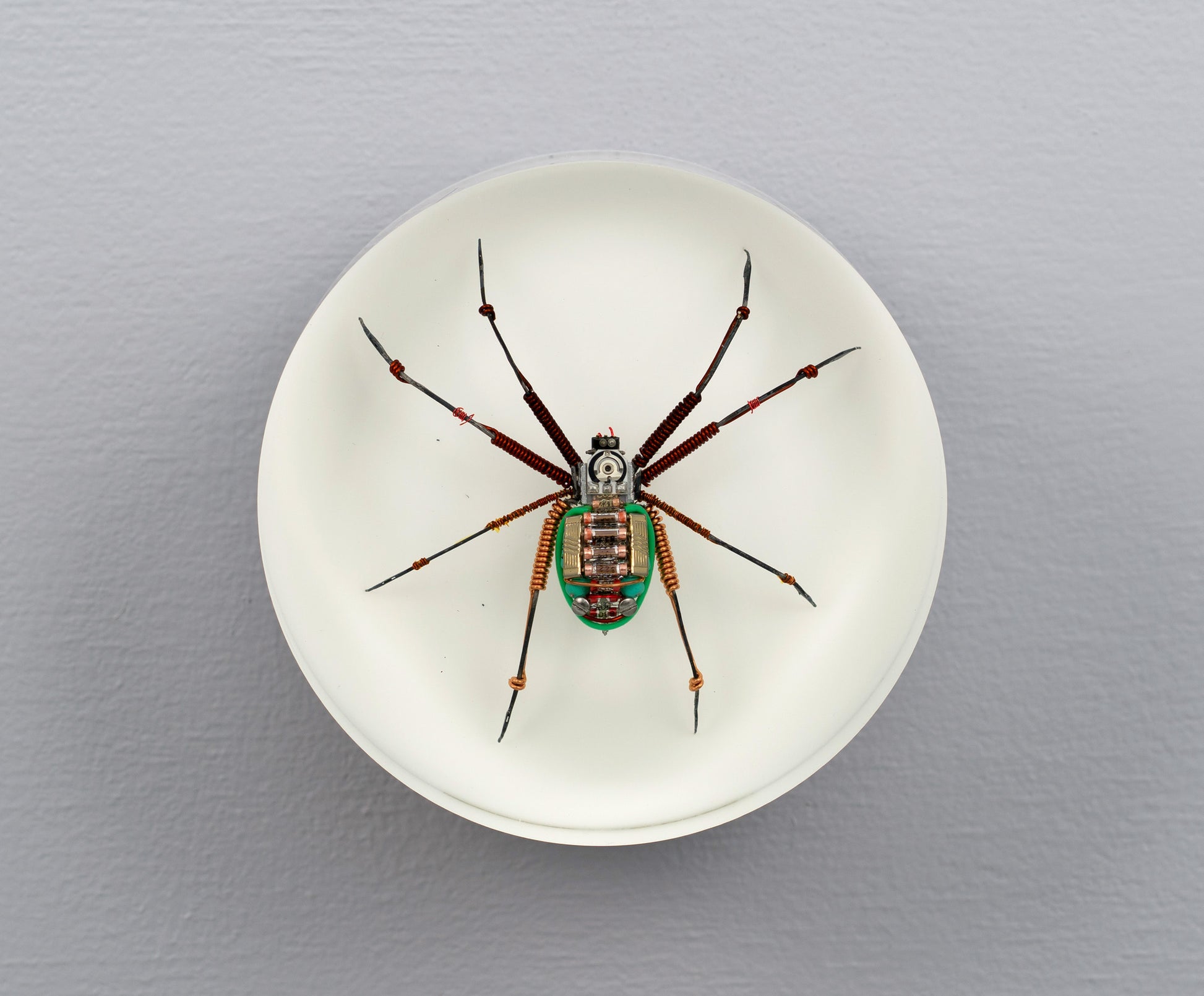 Found objects (camera parts, watch parts, electronics, transformer wire), pressure-cast urethane resin, alum hanger with hardware.