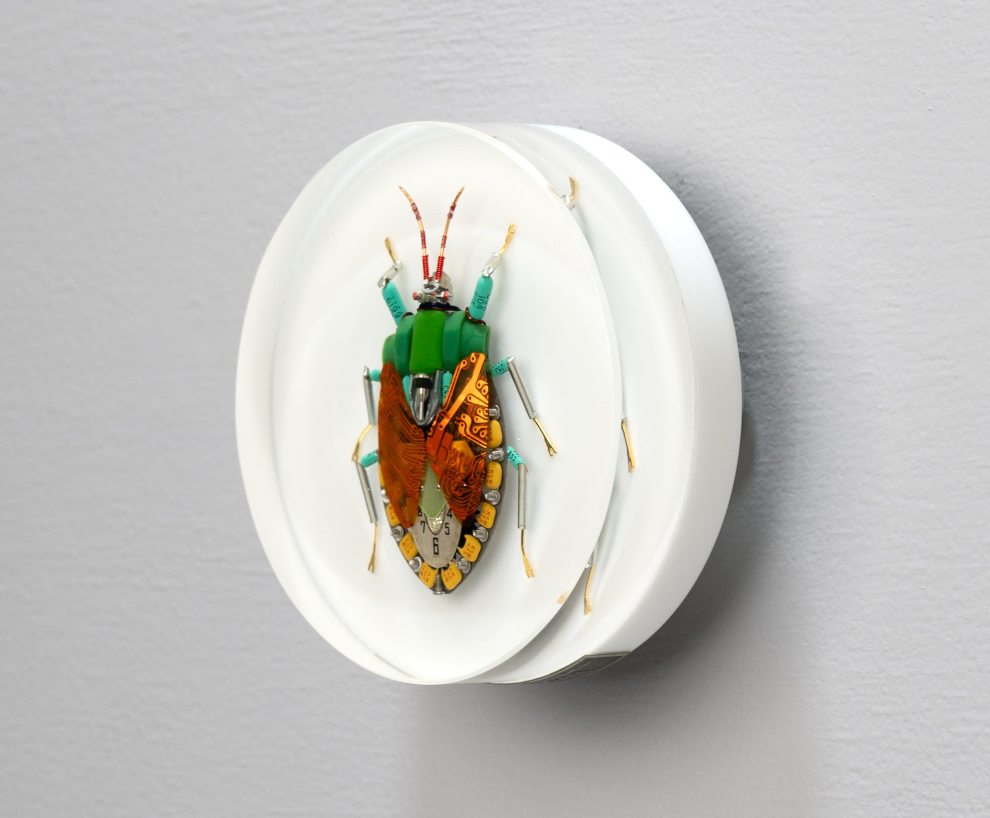 I happened to have the parts on hand so I assembled two of these shield beetles. The green thorax is made of a central, green, vintage capacitor and single green button (cut in half) from an old mechanical adding machine on the left/right sides of that capacitor. The orange part of the beetle is kapton circuit film, cut to shape. There are two watch faces used underneath the orange kapton. You'll see the 6:00 side on of of these beetles, the 12:00 on the other. The silver parts in the center of the body are from a Bic lighter and a shrader valve (used in bicycle tires.) All of the feet are made from gold-plated electrical contact wires of some type — one of the many odd parts I have around.