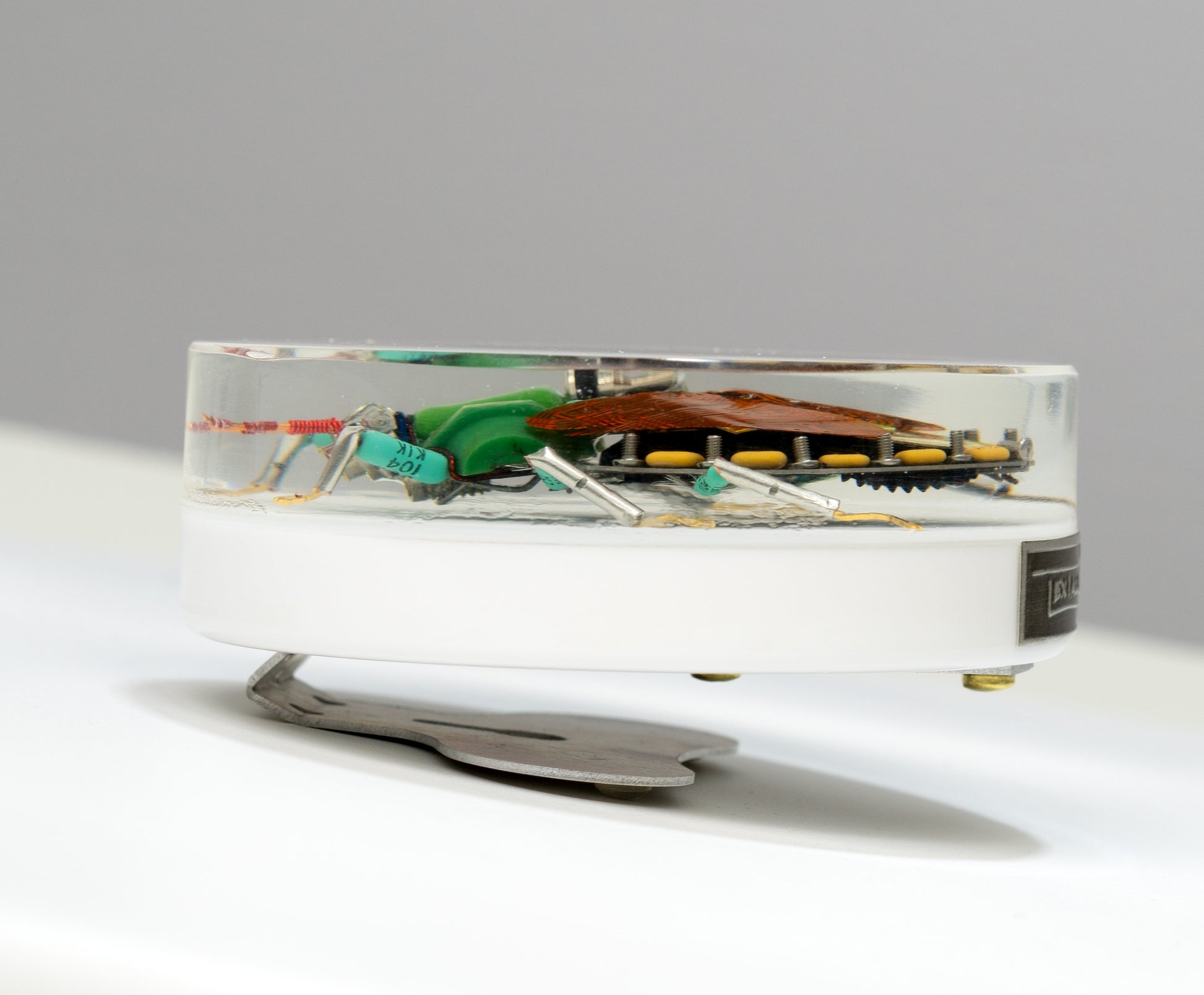 Found objects (camera parts, watch parts, electronics, transformer wire), pressure-cast urethane resin, alum/brass hanger.