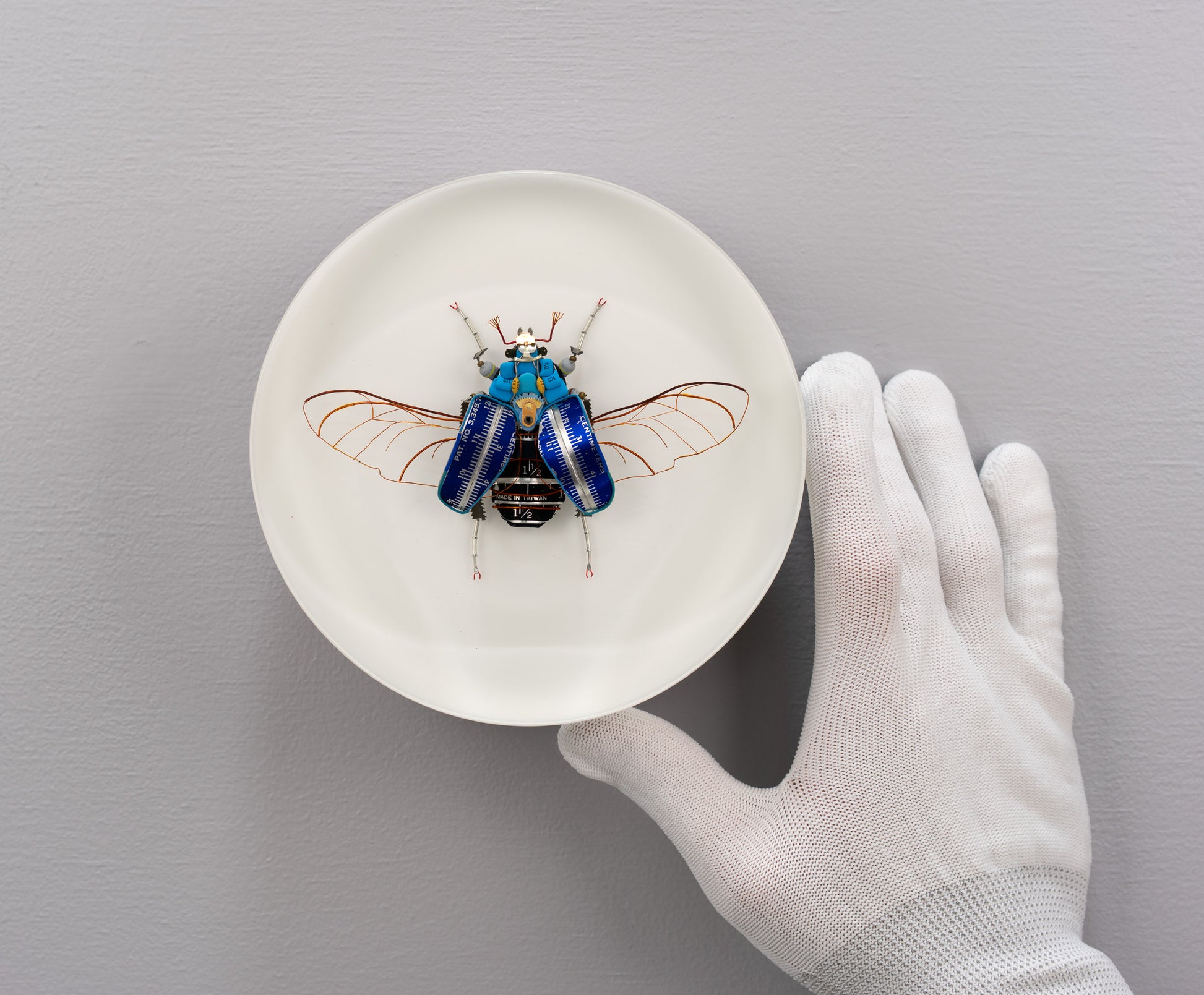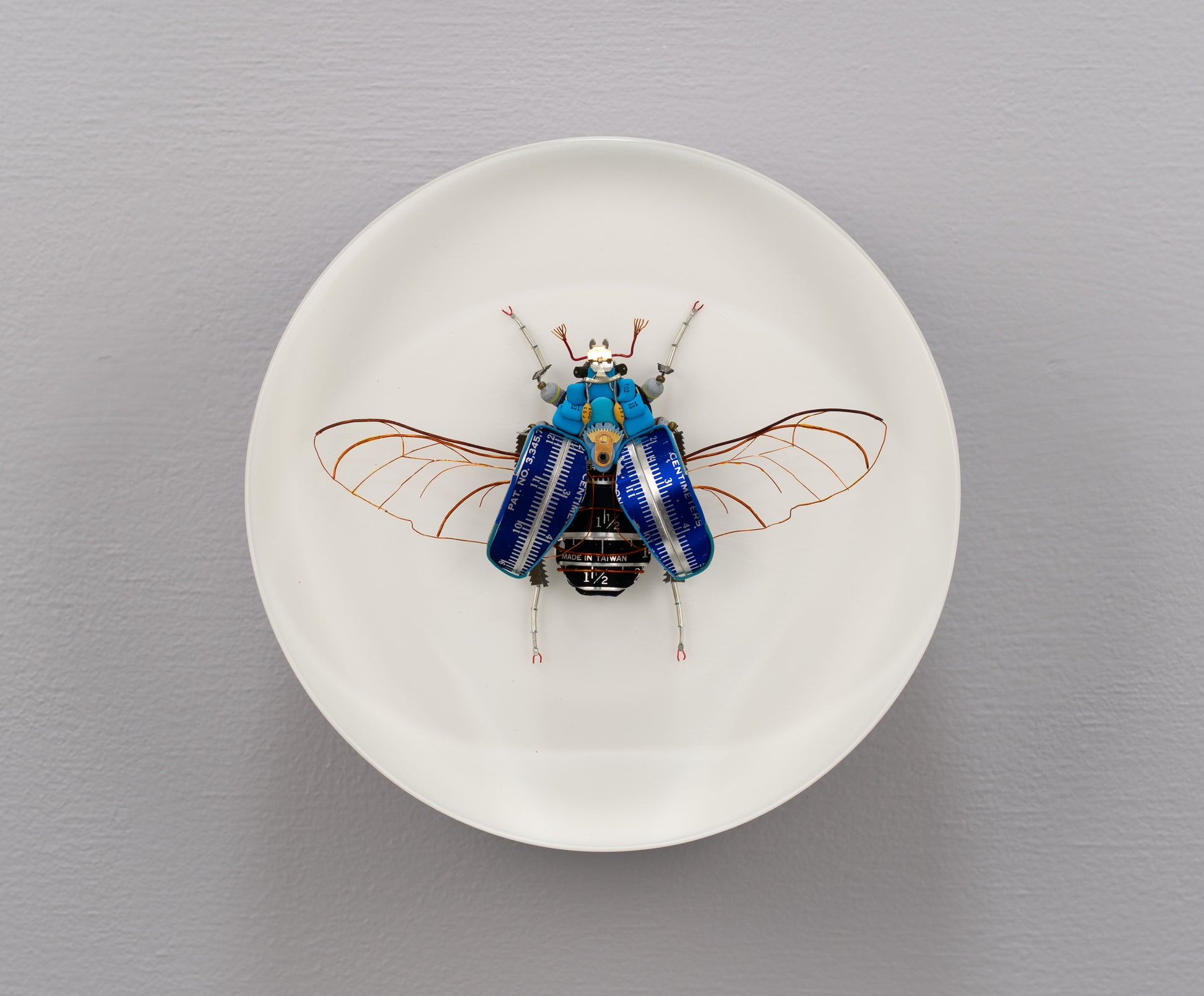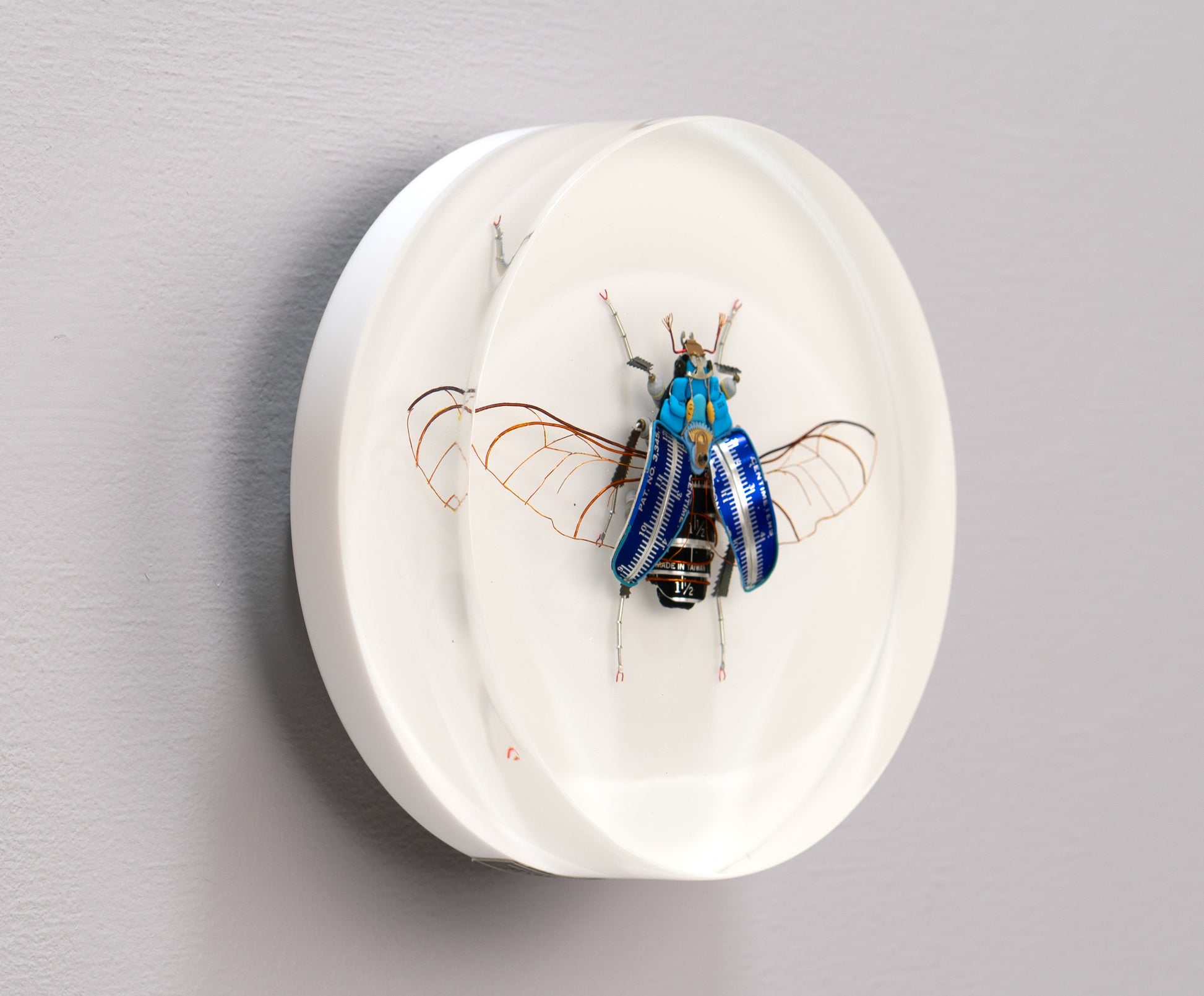 Flower beetles are one of my favorite species to emulate. The elytra (the blue beetle 'shells') are made from sewing gauges/rulers. I took the liberty of trimming and bending these aluminum pieces to form the shells. The wings are made from wire scavenged from the transformers found inside old machines.