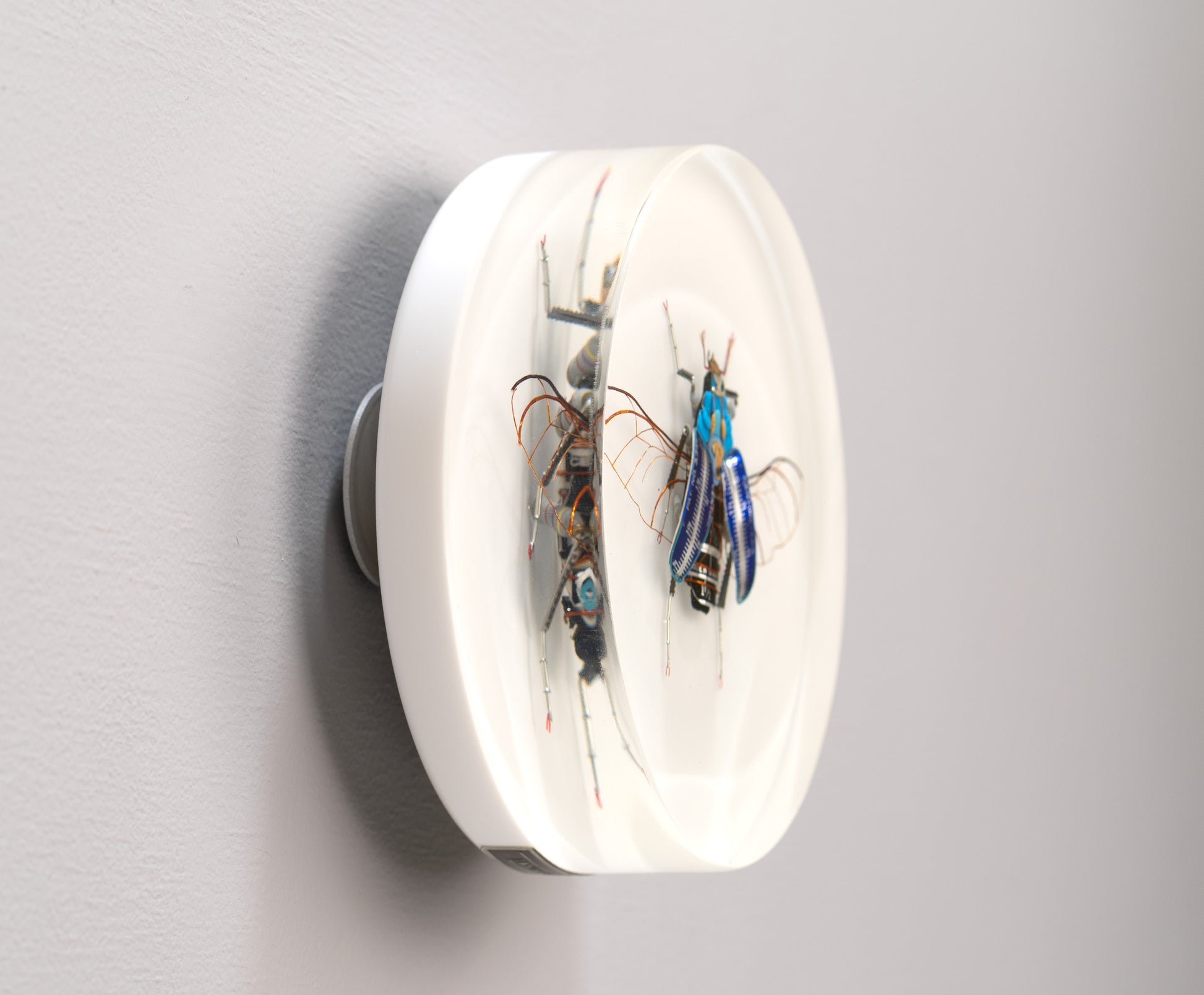 Found objects (camera parts, watch parts, electronics, transformer wire), pressure-cast urethane resin, alum/brass hanger.