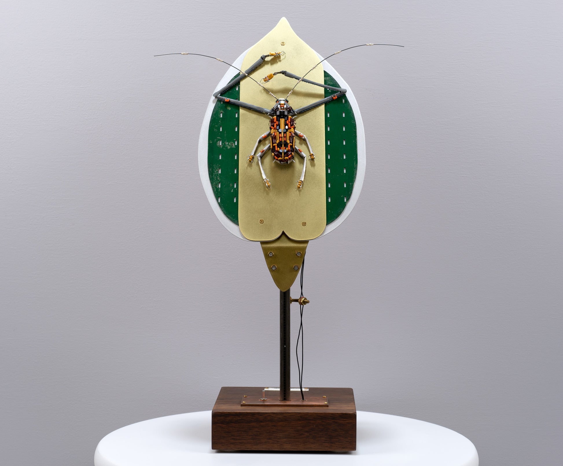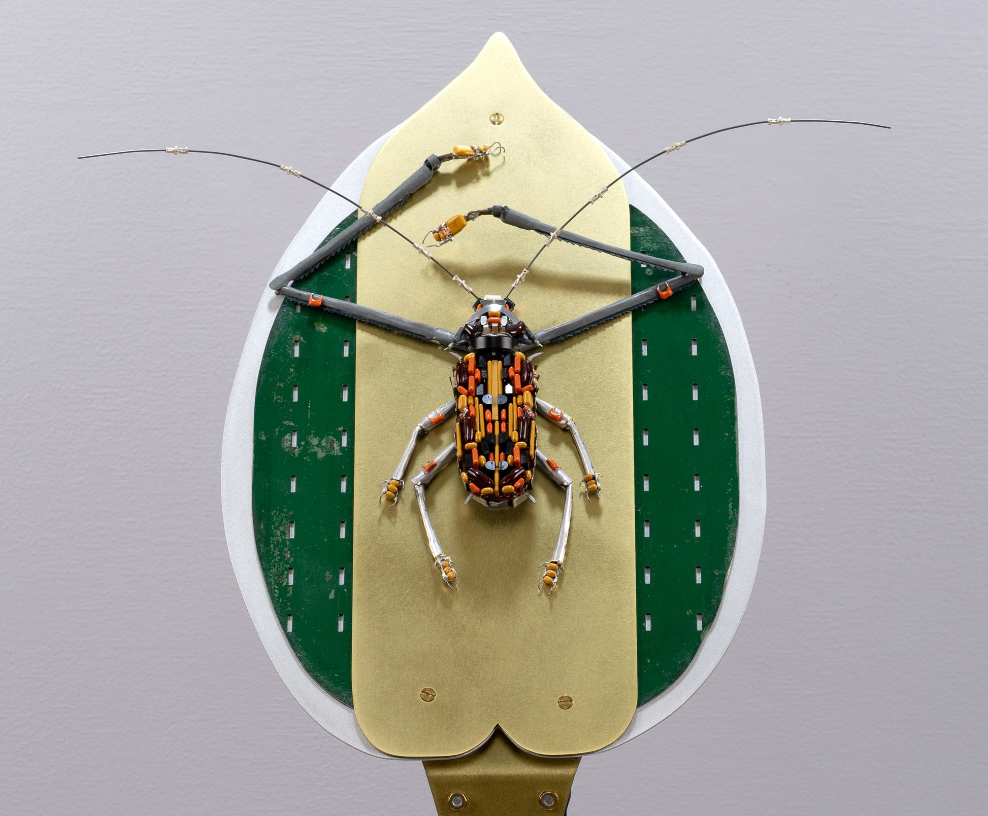 Harlequin beetles (arguably one of the most unique beetles) in the real world always appear as gentle giants — this sculpture tries to capture that gentleness in its movement. This kinetic, assemblage sculpture is made primarily made from vintage electronic components and modified parts from old adding machines along with other found objects.