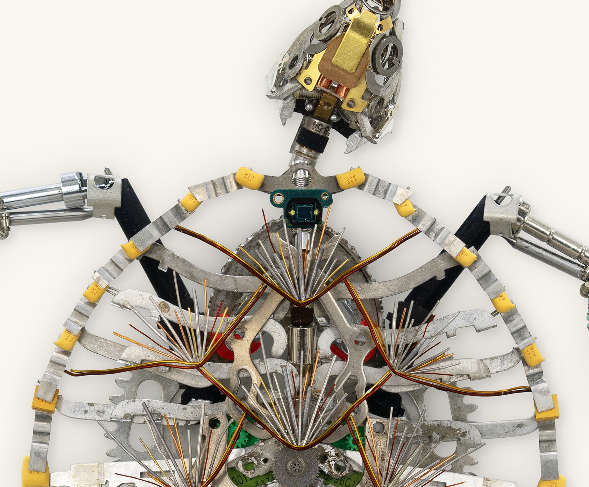 - This is a photograph of an assemblage sculpture I have created out of found objects, electronics, camera parts and transformer wire.