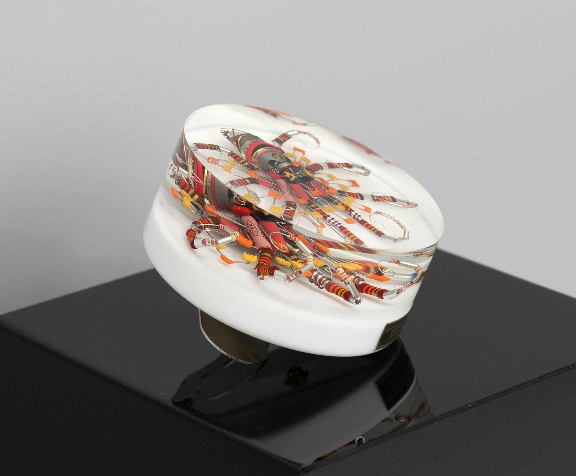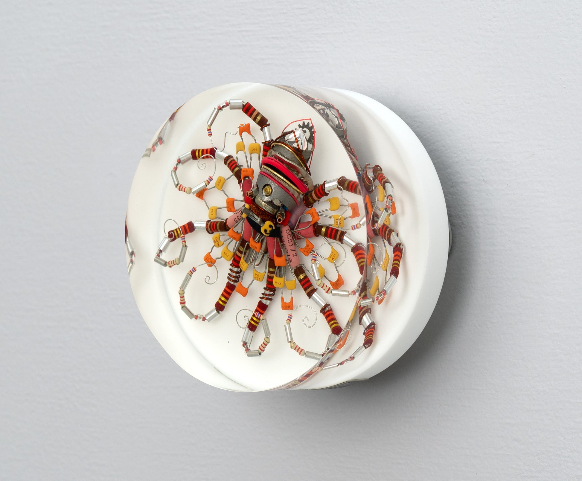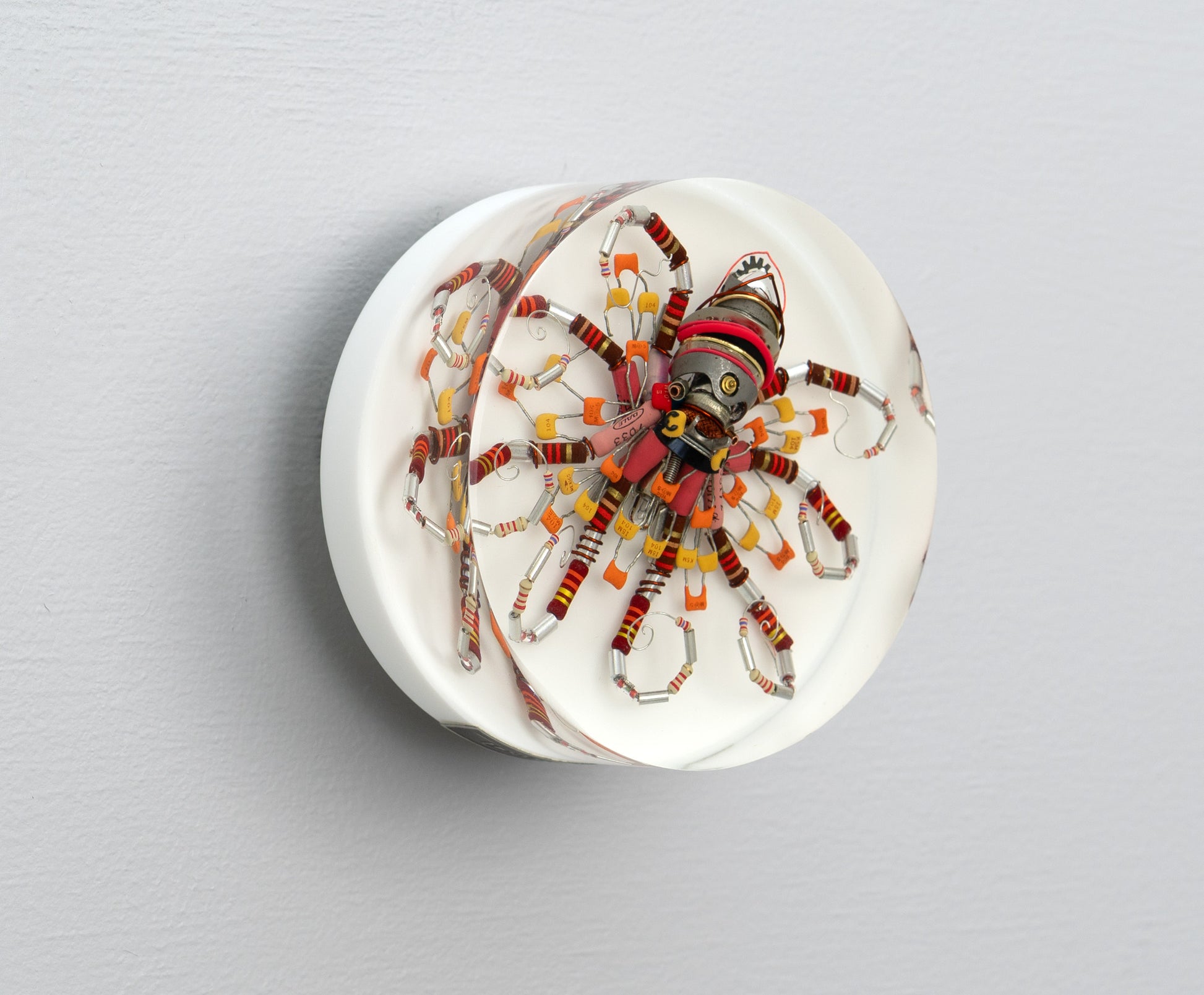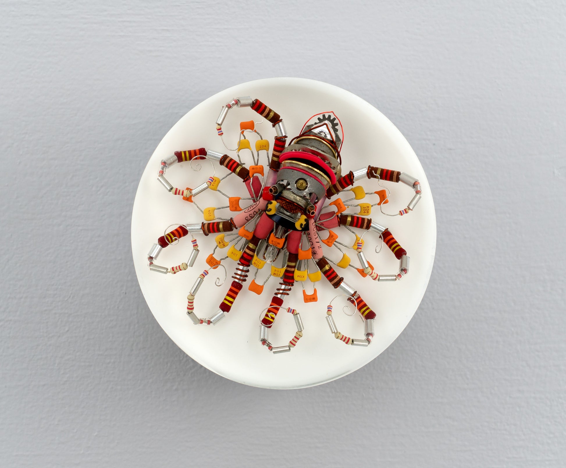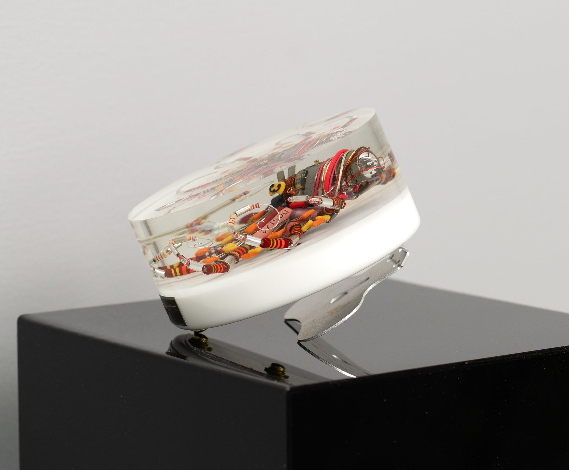 Found objects (vintage camera, watch and electro-mechanical parts, light bulb), pressure-cast urethane resin, custom aluminum bracket