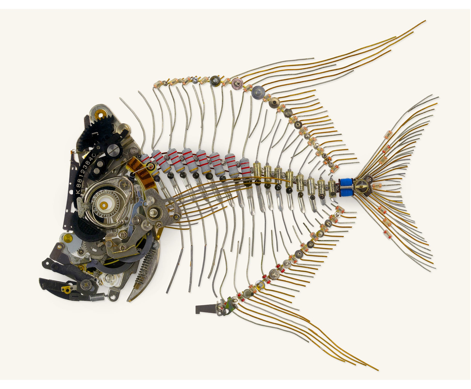 - This is a photograph of an assemblage sculpture I have created out of found objects, electronics, camera parts and transformer wire.