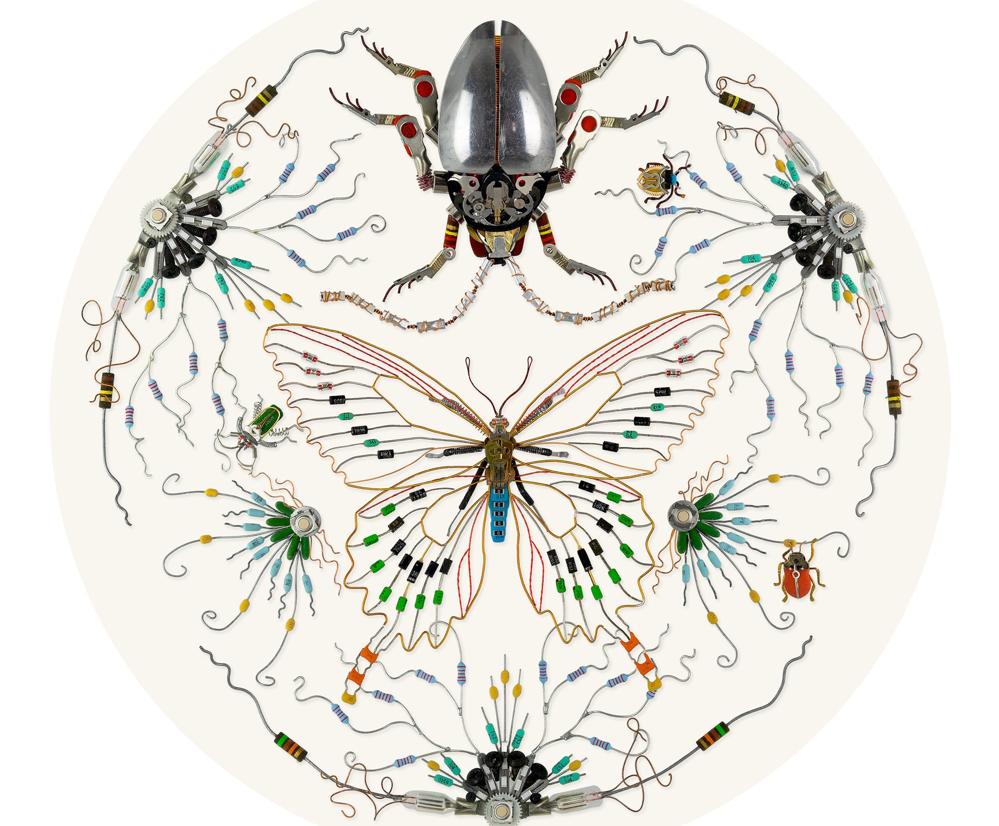 - This is a photograph of an assemblage sculpture I have created out of found objects, electronics, camera parts and transformer wire.