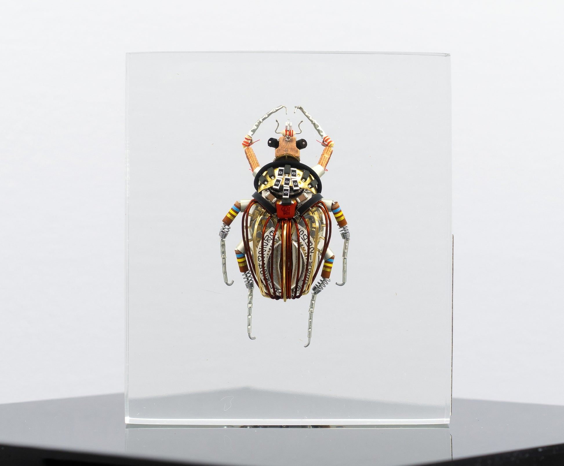 Found objects (camera parts, watch parts, electronics, transformer wire), pressure-cast urethane resin.