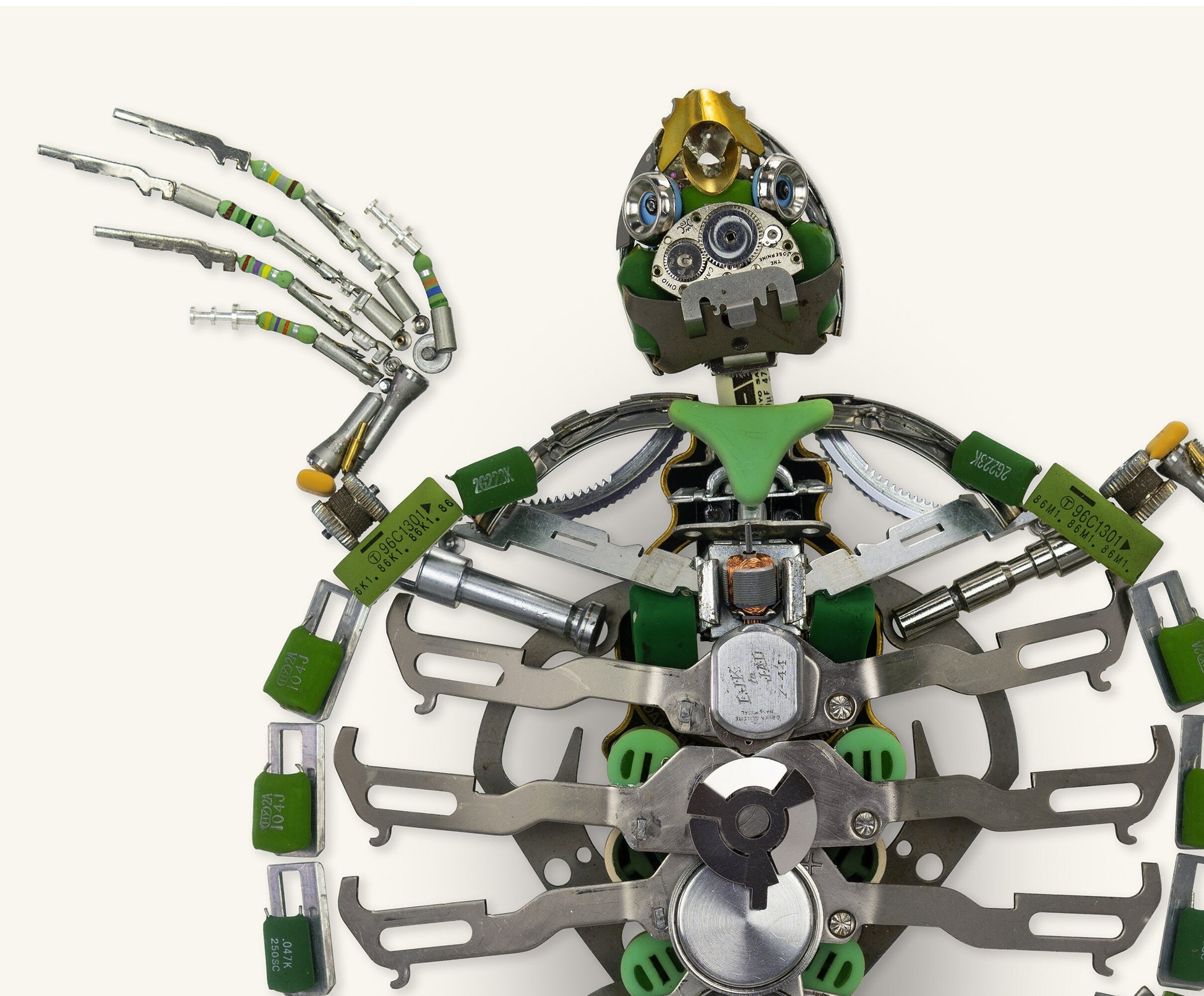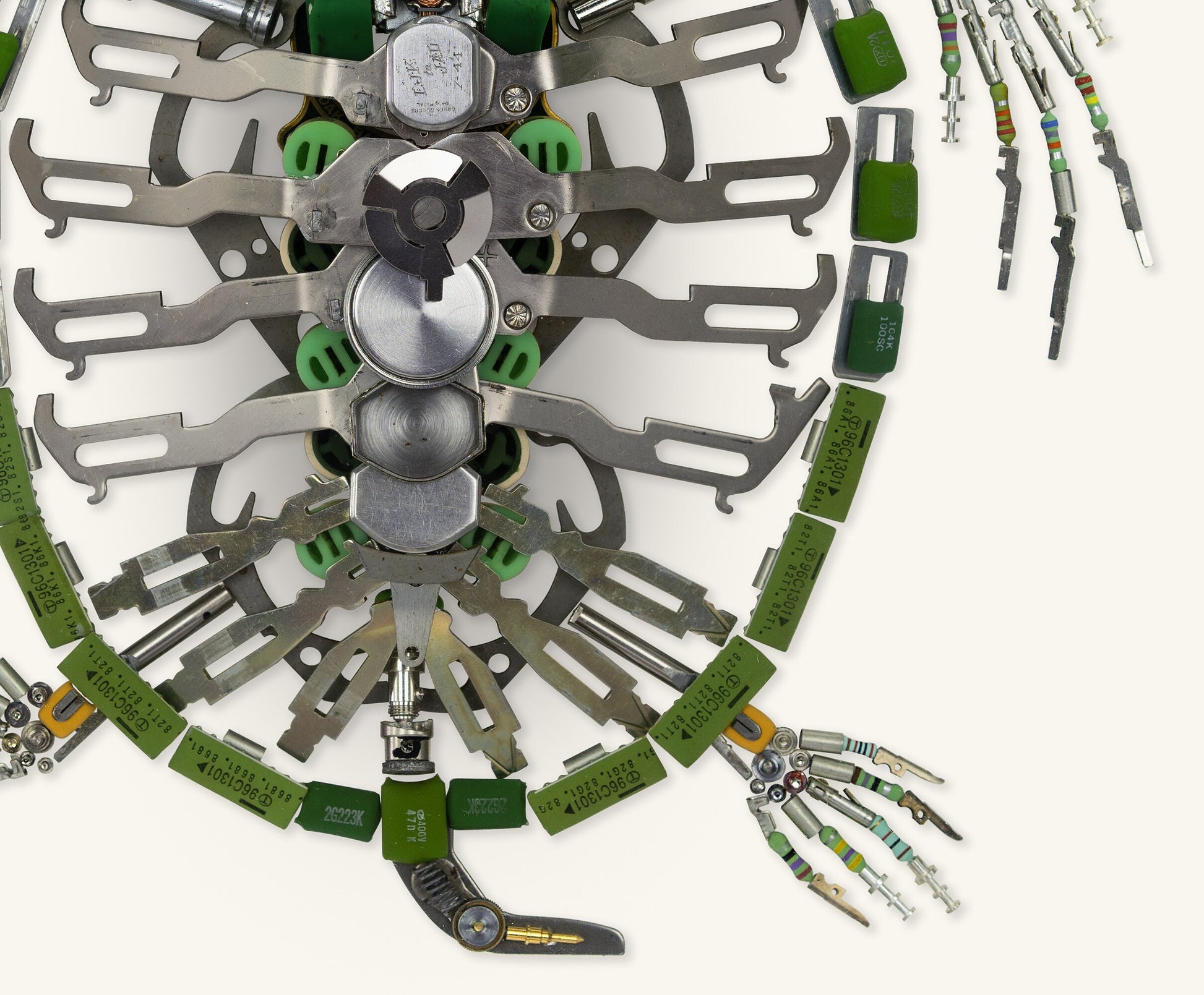 - This is a photograph of an assemblage sculpture I have created out of found objects, electronics, camera parts and transformer wire.