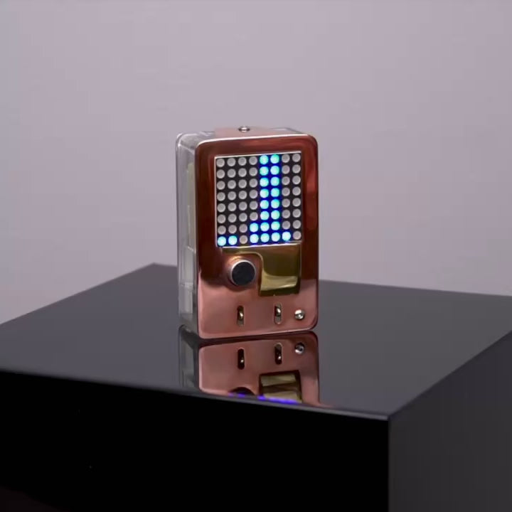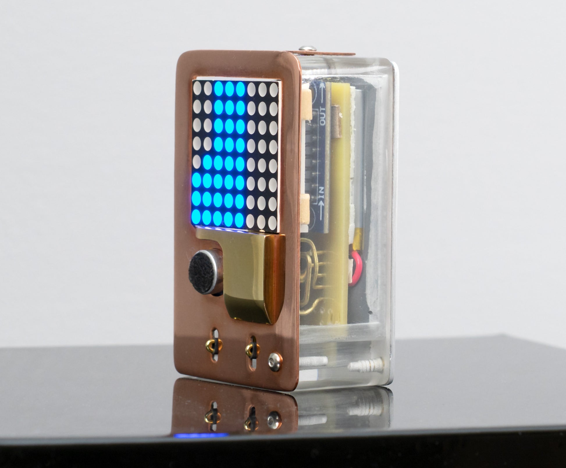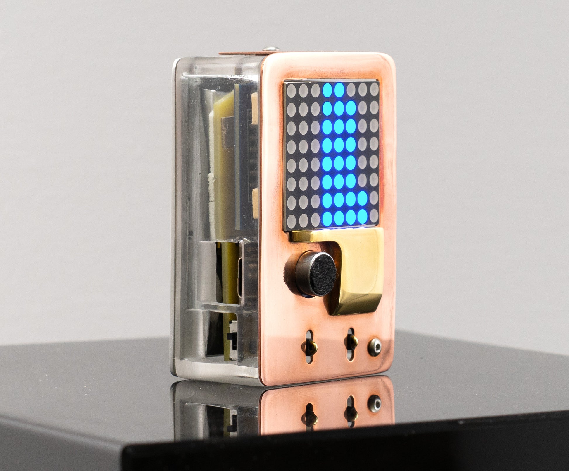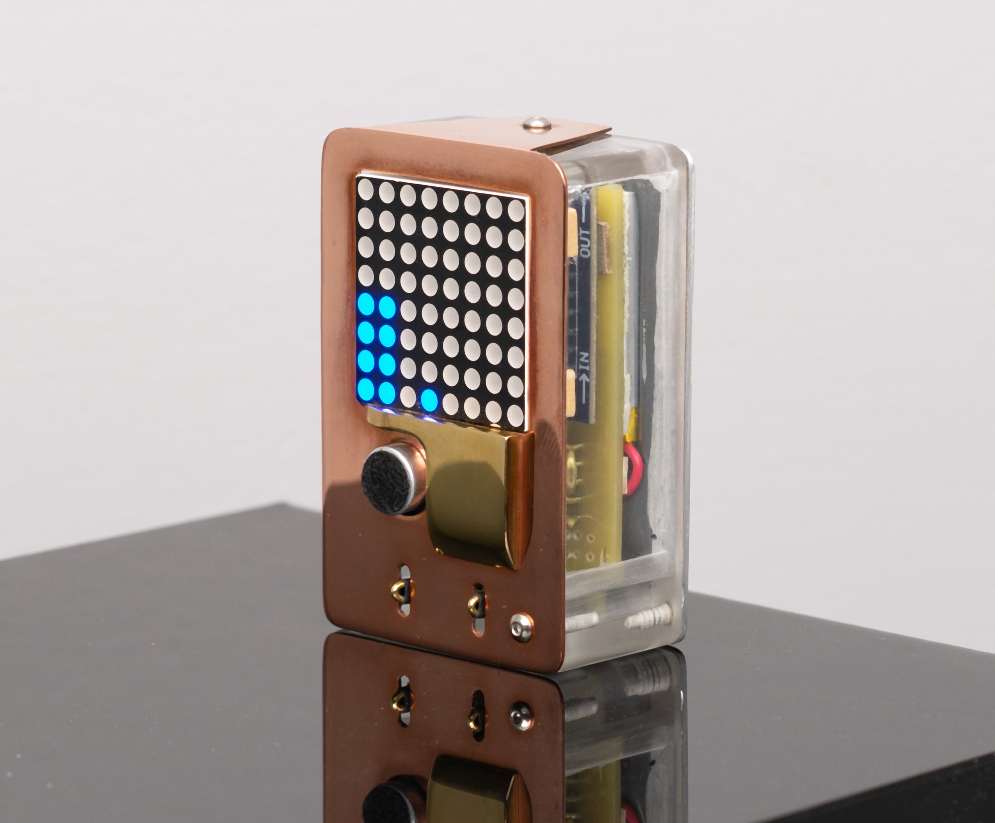 ESP32 microcontroller, lipo Battery, microphone, switch, LED matrix, custom circuit board, pressure-cast urethane, copper, brass, blackened steel, hardware, USB cable with AC/DC adapter