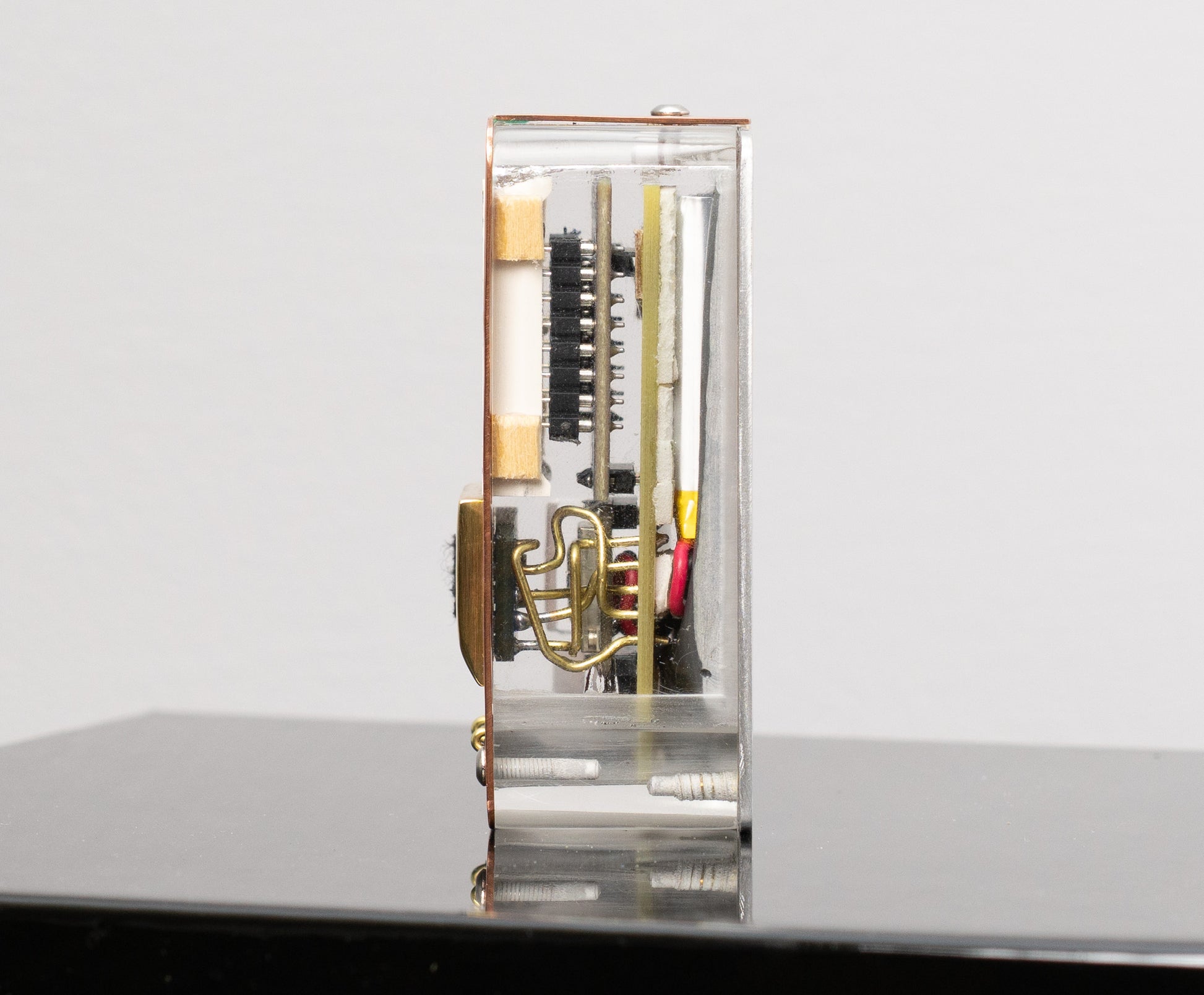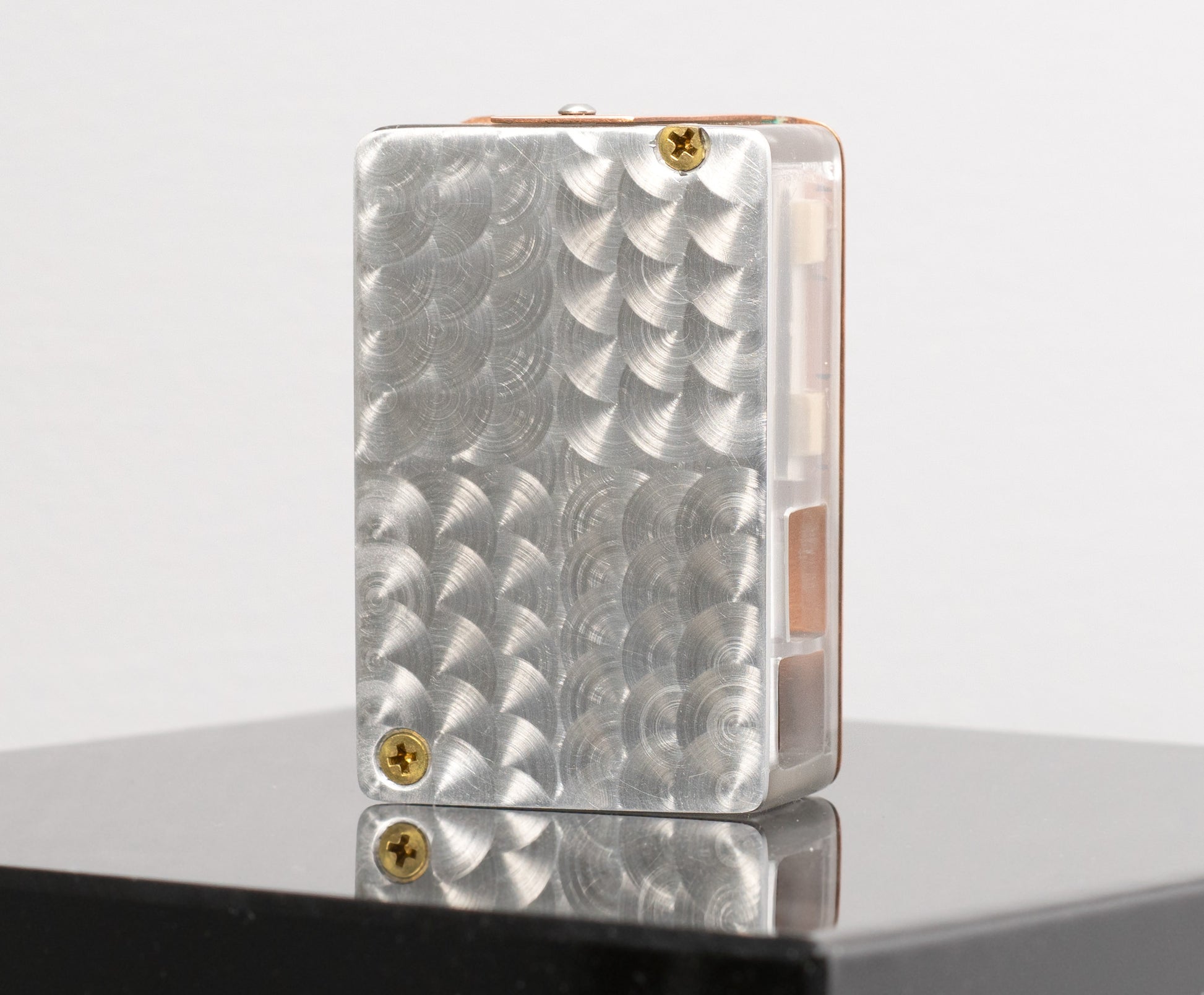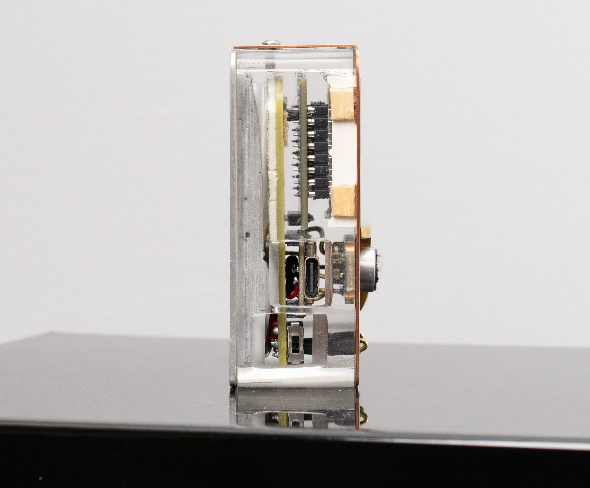 This pocket-sized small sounds analyzer listens to the noise in the room and responds to the ranges of frequencies by activating 8 columns of blue LED lights. The case started with the clear middle section — a custom sculpted/molded piece then cast in clear urethane. The back is aluminum and the face is made of two pieces of copper and a chunck of brass, sliver soldered together and polished. There are two small brass touch-buttons on the bottom of the face.