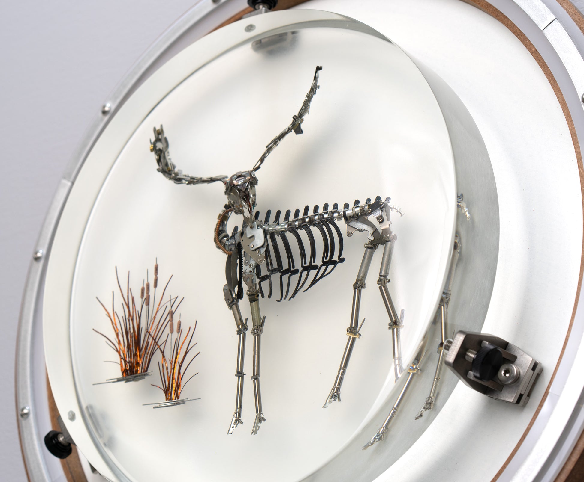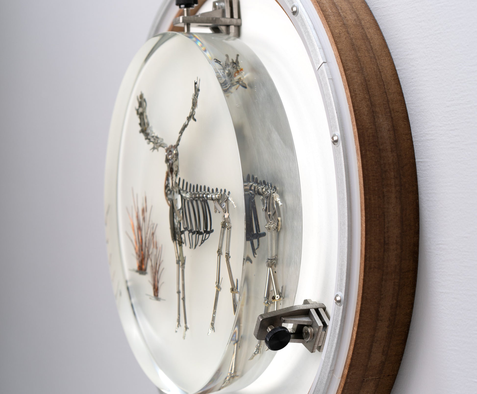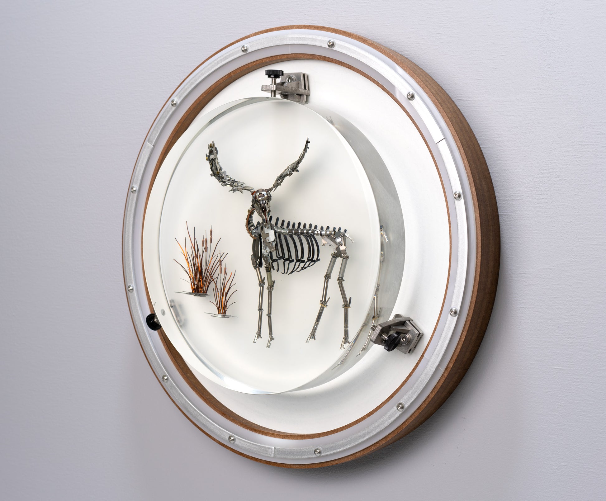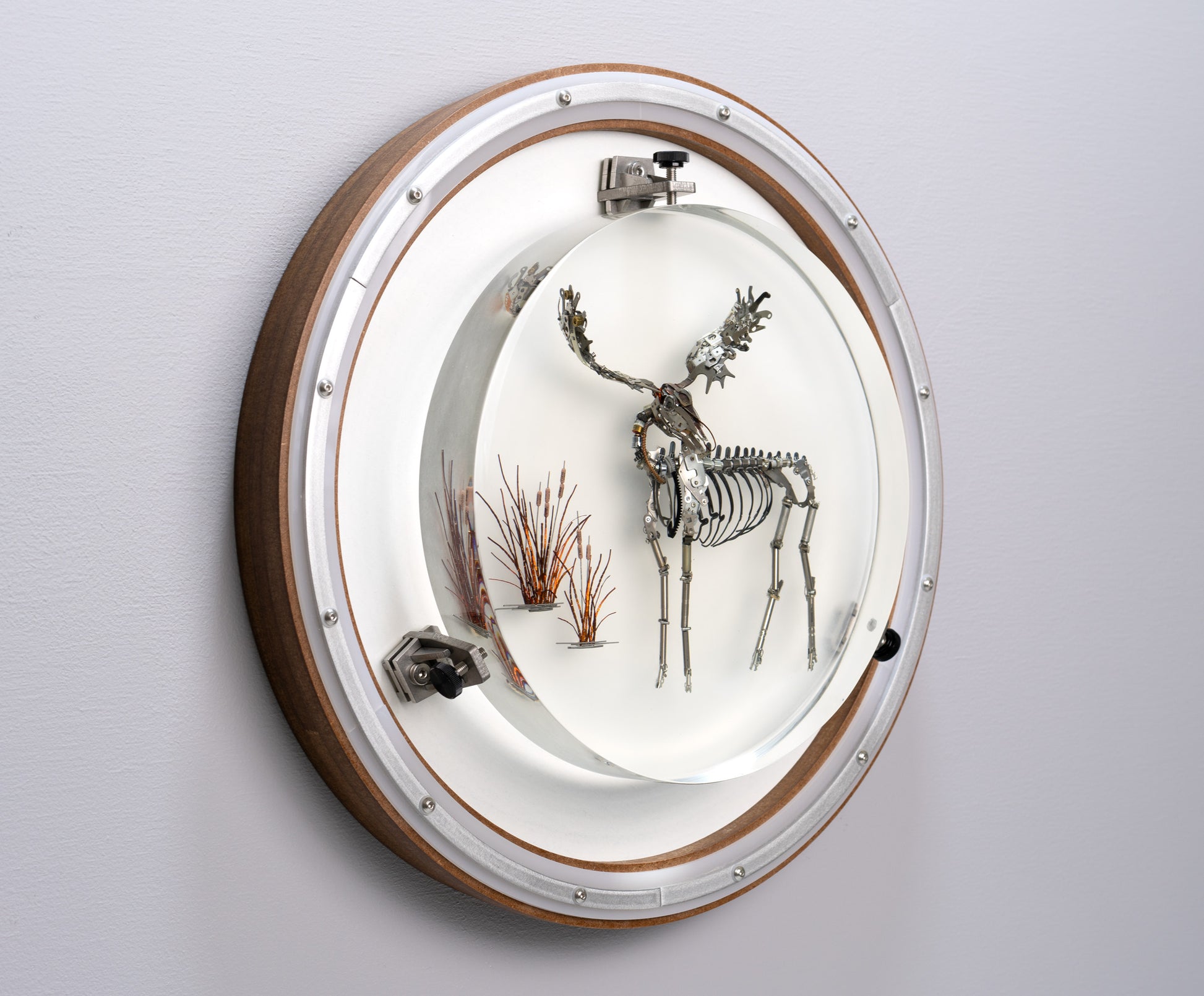 Found objects (vintage camera and electro-mechanical parts), pressure-cast urethane resin, custom brackets, custom designed frame (mdf, aluminum, acrylic, stainless and nylon hardware).
