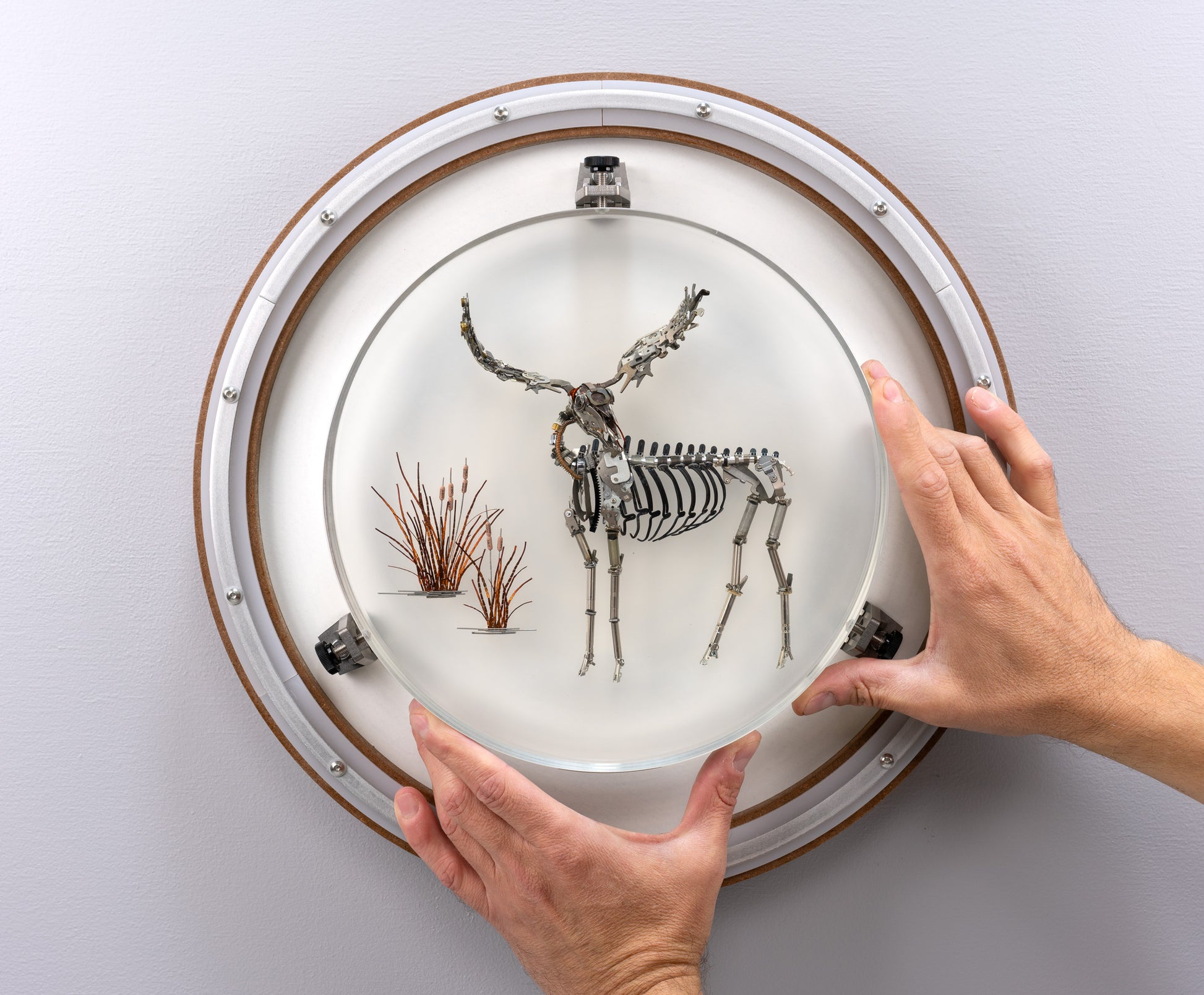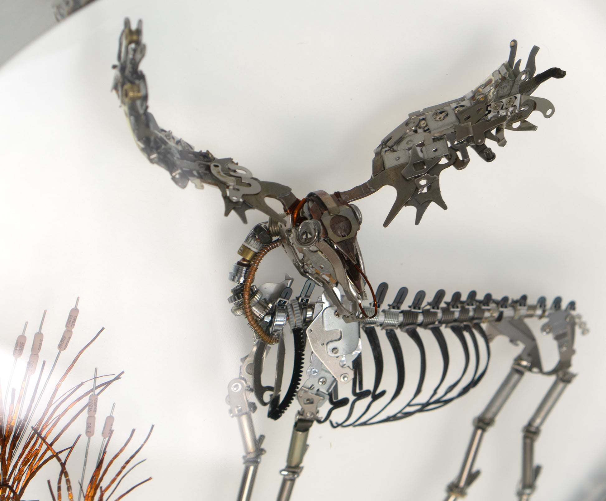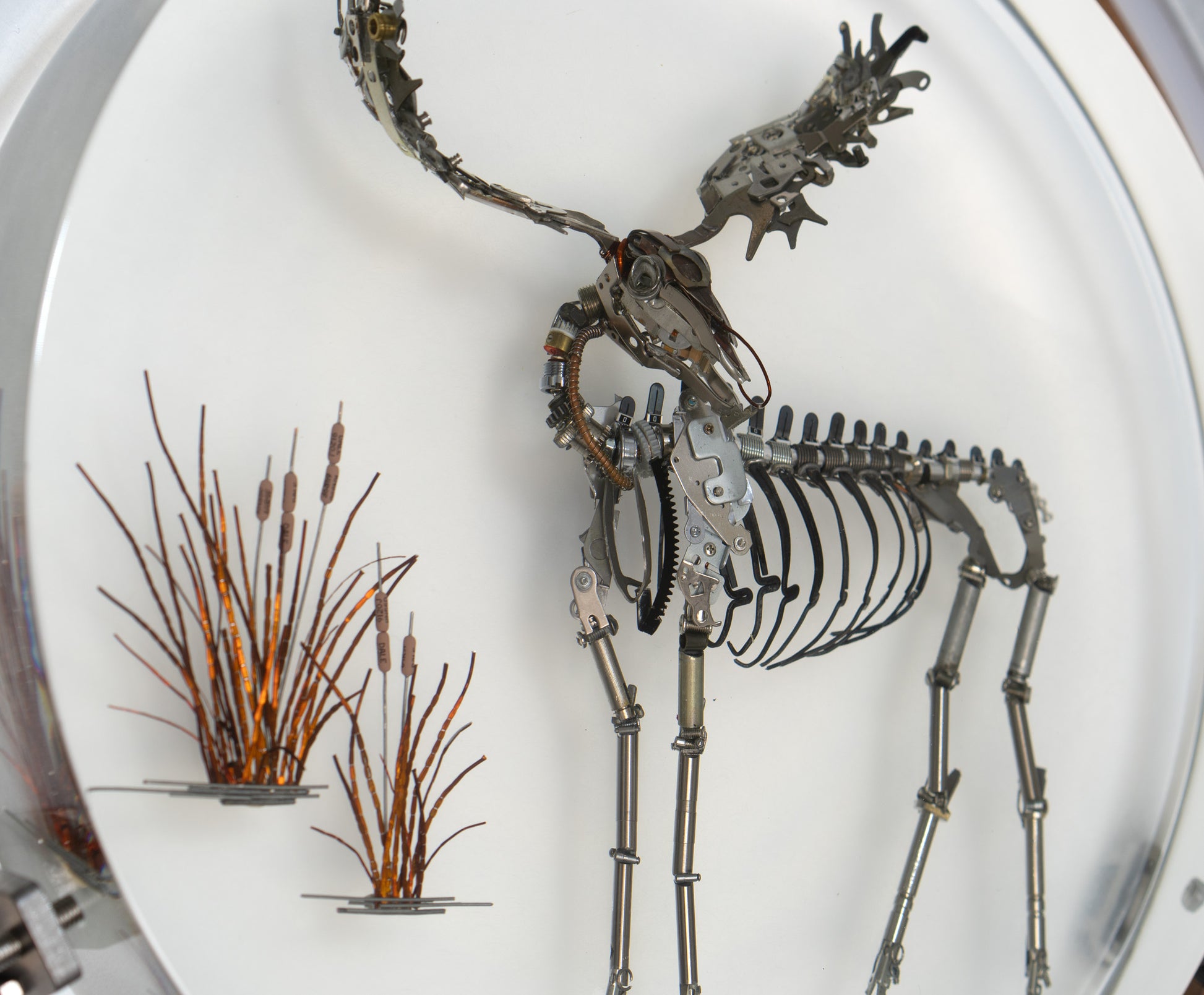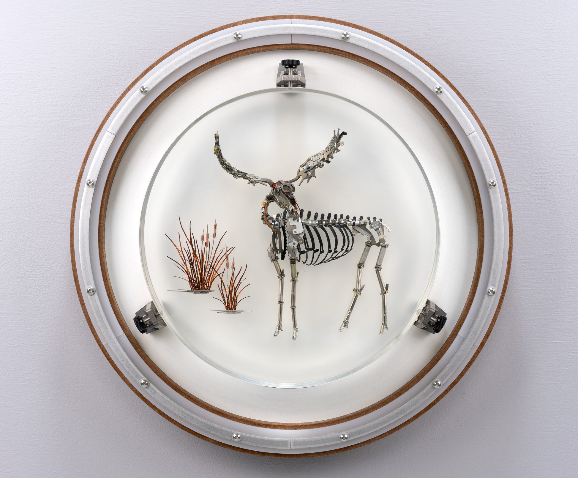 Found objects (vintage camera and electro-mechanical parts), pressure-cast urethane resin, custom brackets, custom designed frame (mdf, aluminum, acrylic, stainless and nylon hardware).