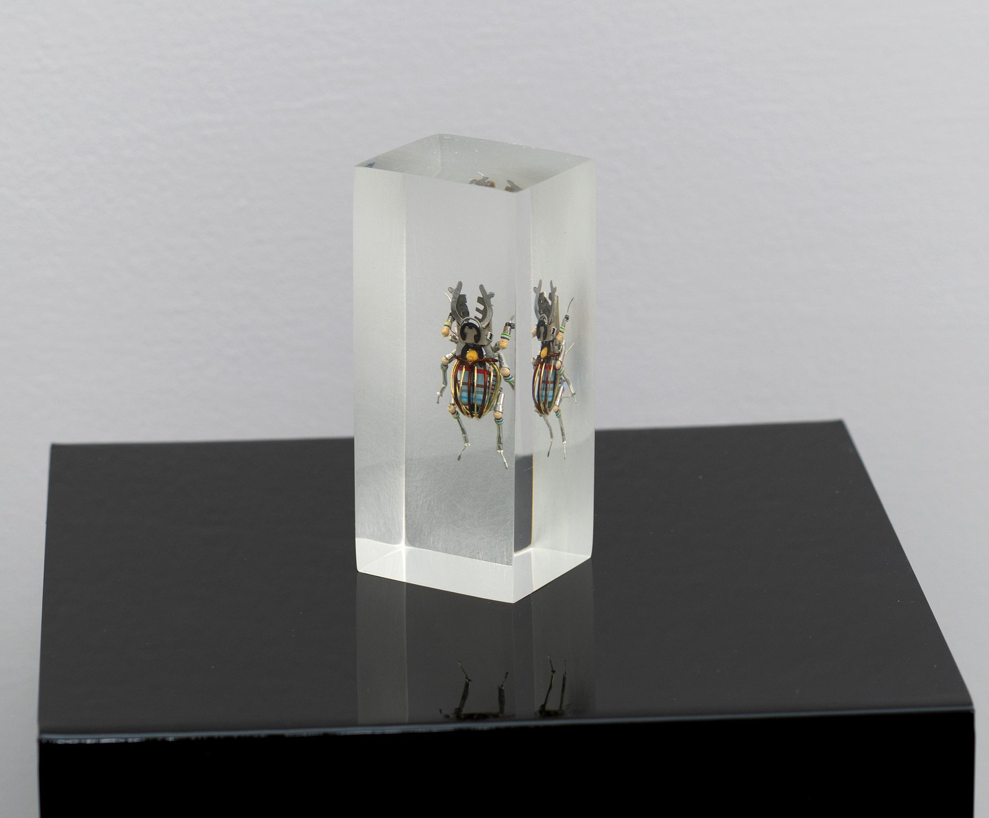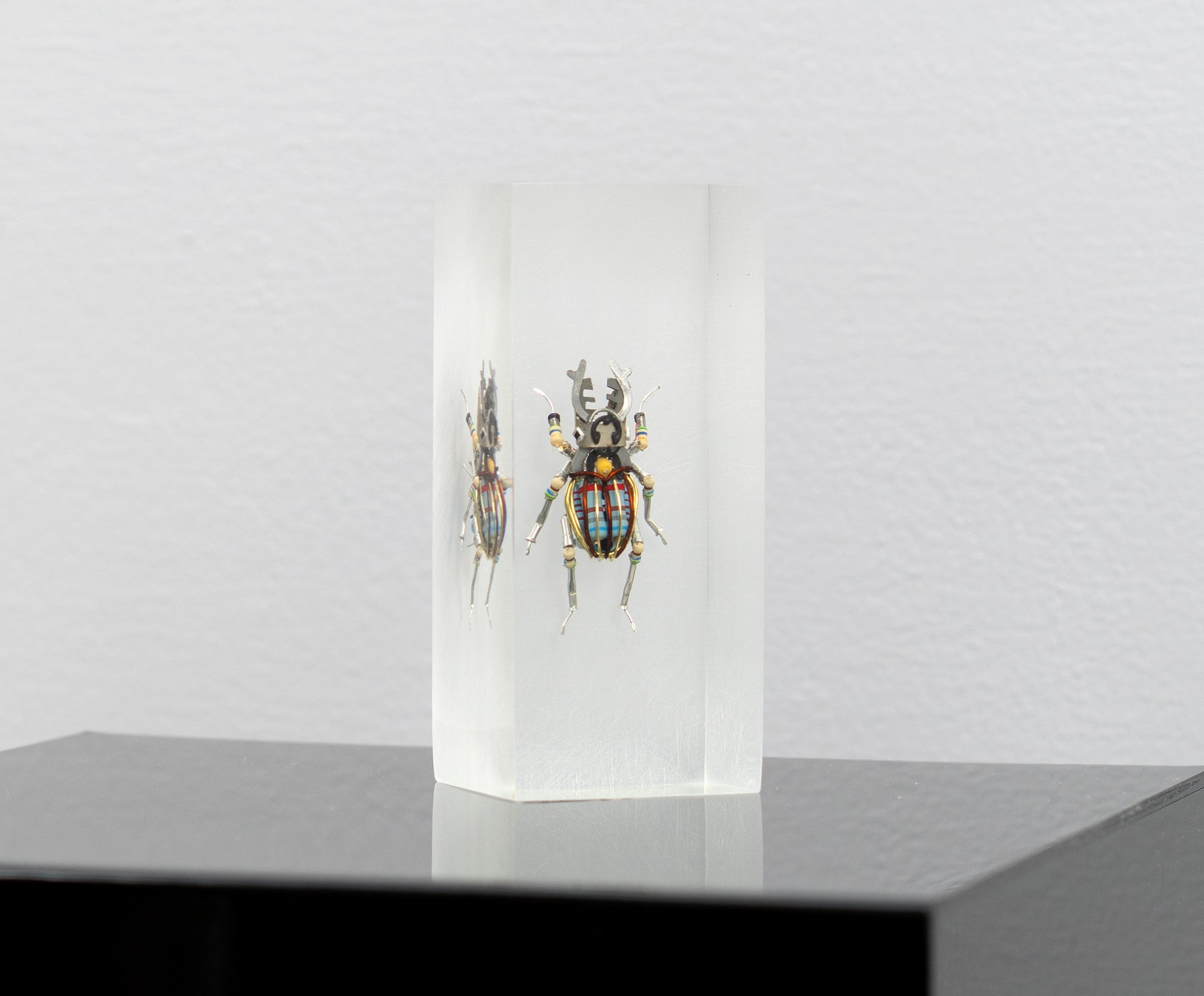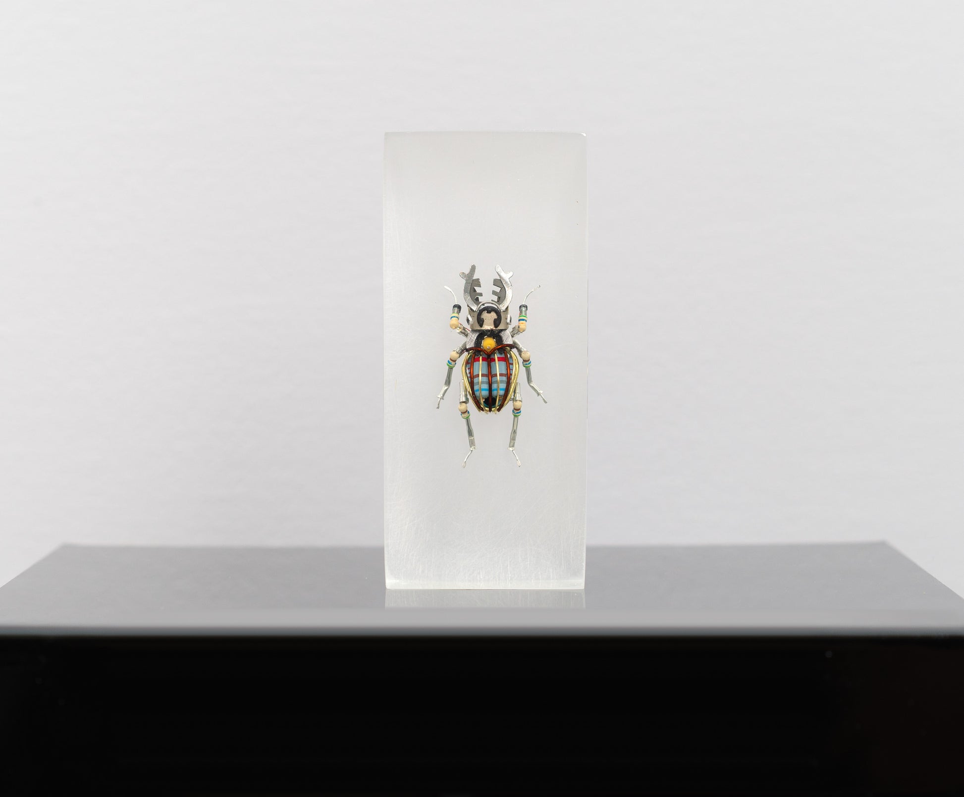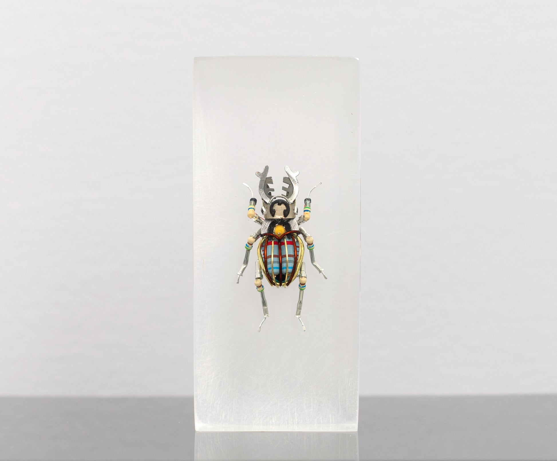I had planned to integrate this stag beetle into a more complex structure with led lights but I couldn't commit to diluting this small creature beacause I enjoy the color-scheme in it so much. This piece does not have a signature but it does come with a COA.
